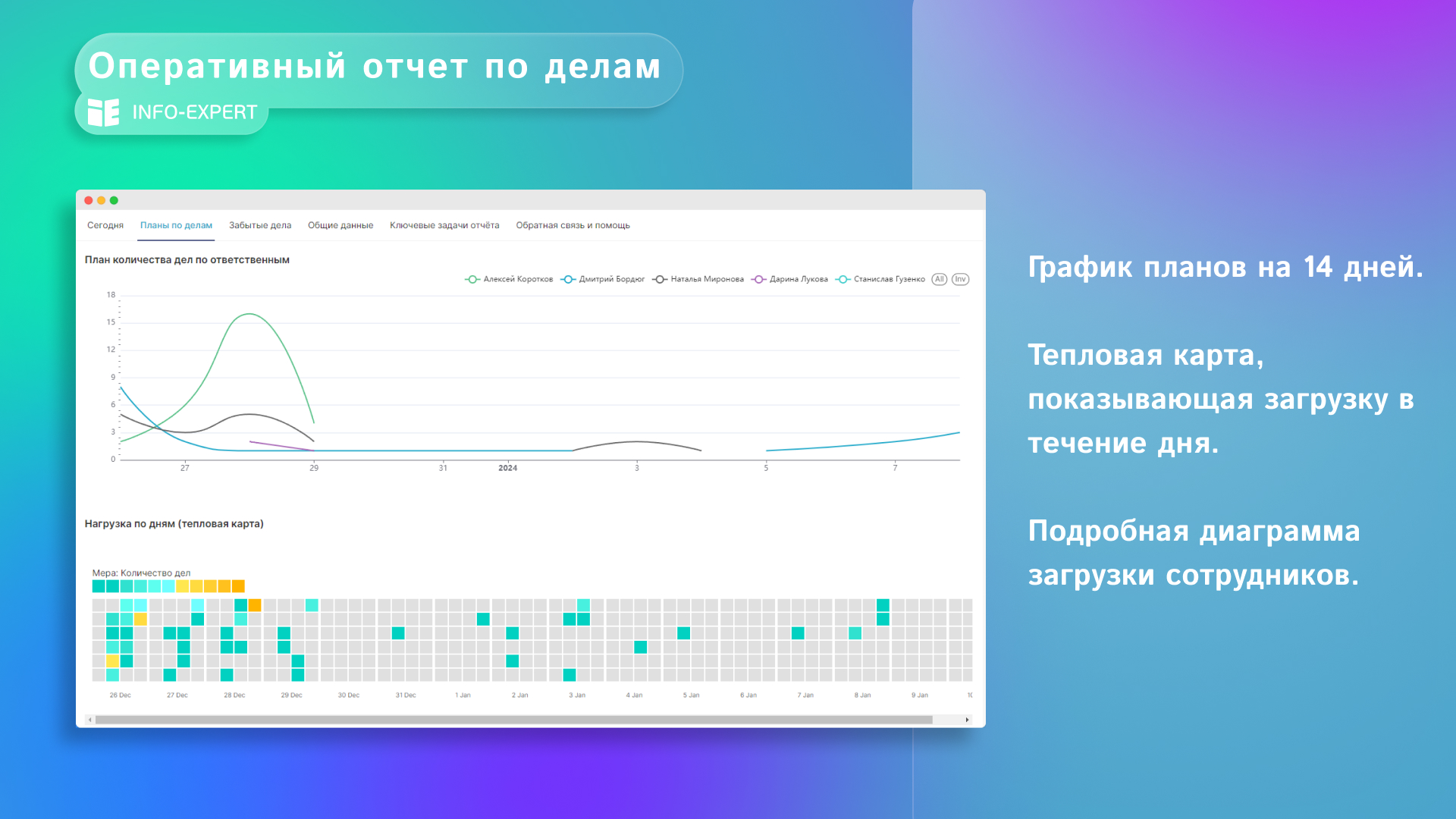 Также есть тепловая карта планов на 14 дней. Она позволяет оценивать количество планов не только по дням, но и по часам в течение дня. Это очень удобно для равномерного распределения дел между сотрудниками.