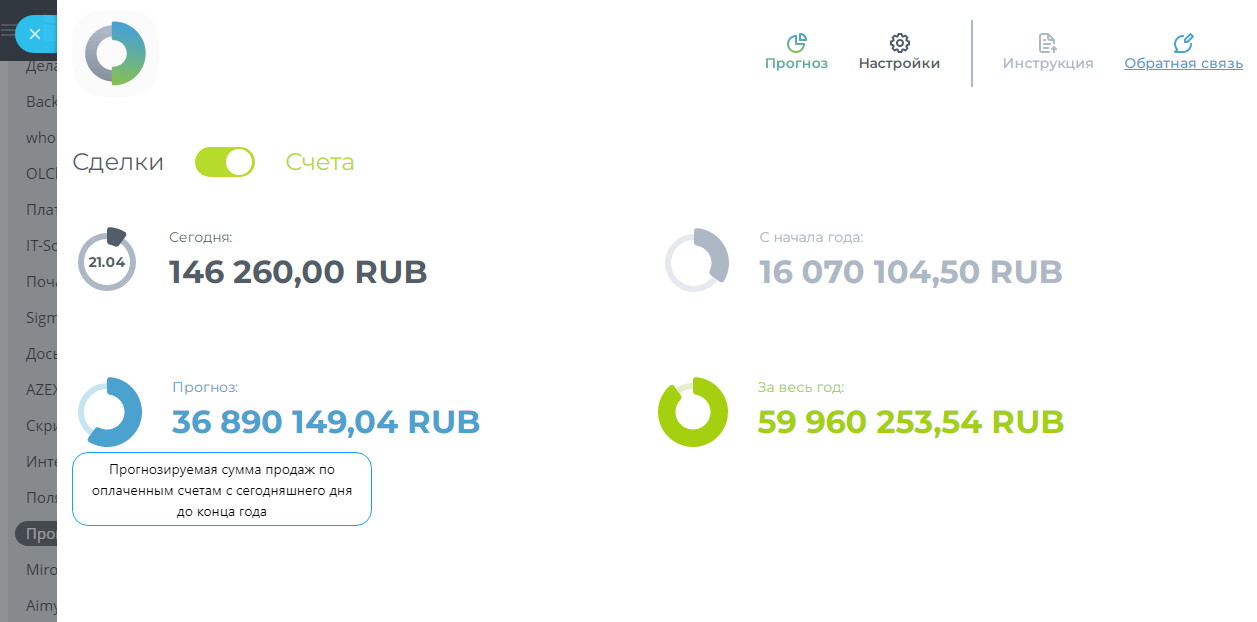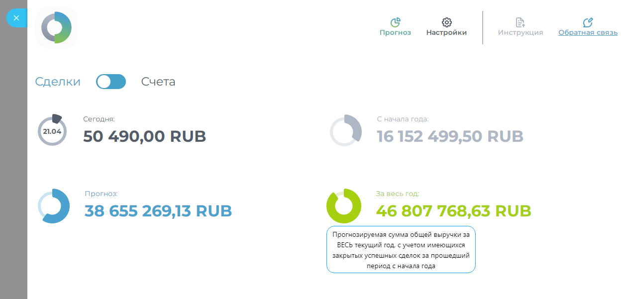 Приложение строит математический прогноз вашей выручки к концу текущего года, на основании успешных сделок или оплаченных счетов с начала года.