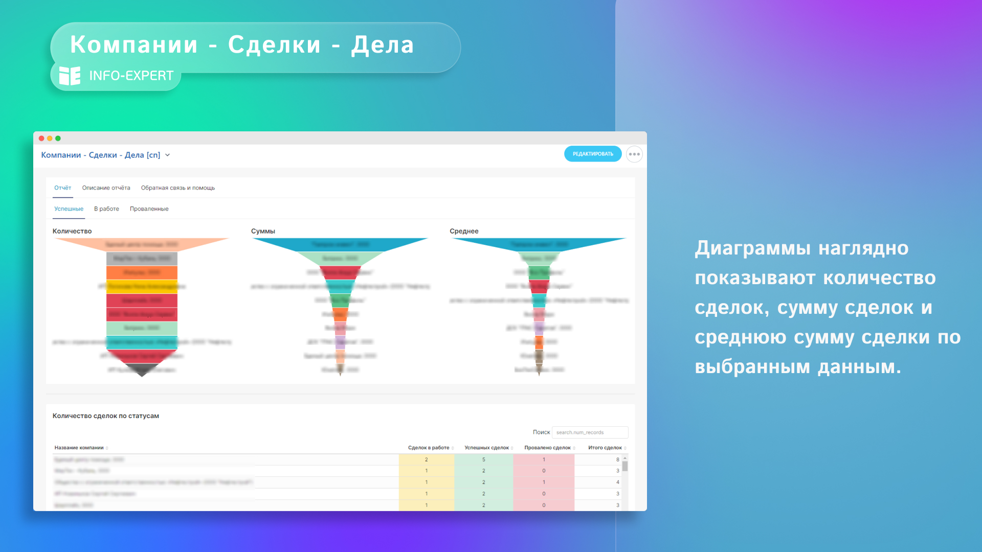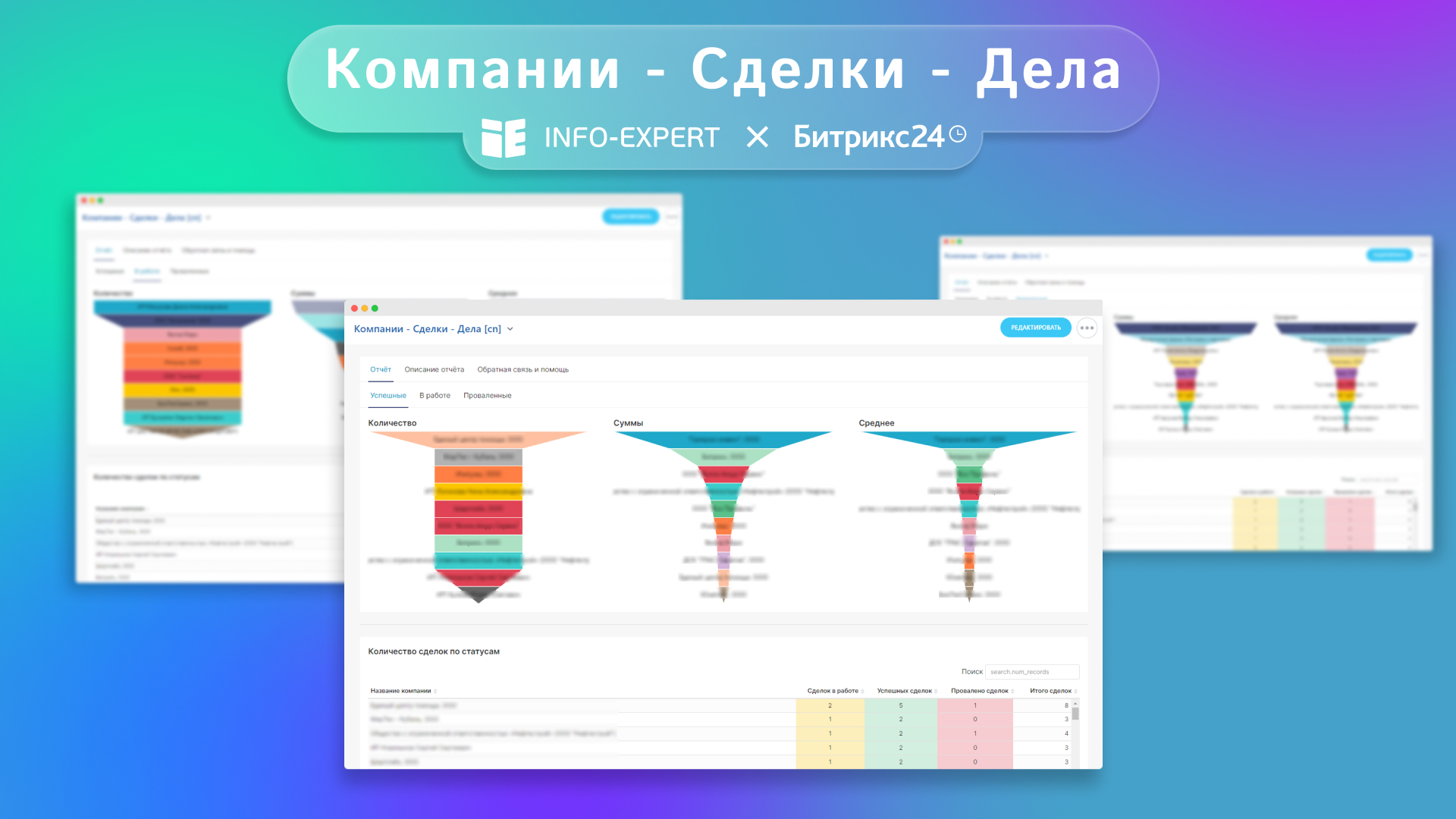 Этот отчет отлично подойдет для быстрого анализа общих показателей по Сделкам и Делам в разрезе Компаний. Данные, которые предоставит отчет помогут проанализировать работу по конкретному направлению (воронке), менеджеру или просто узнать, с какими компаниями работа идет более успешно, а с какими много сделок проигрывается.