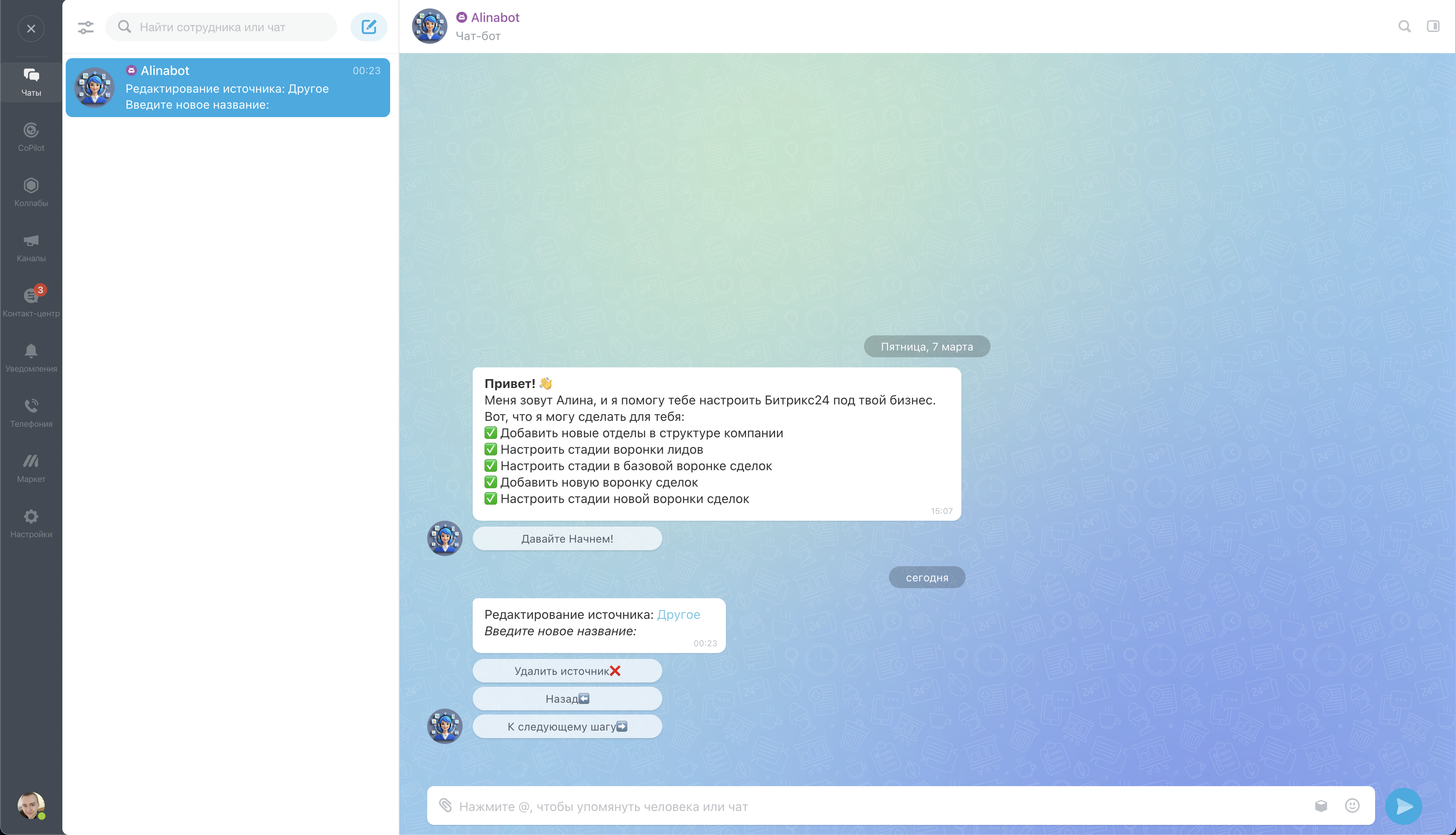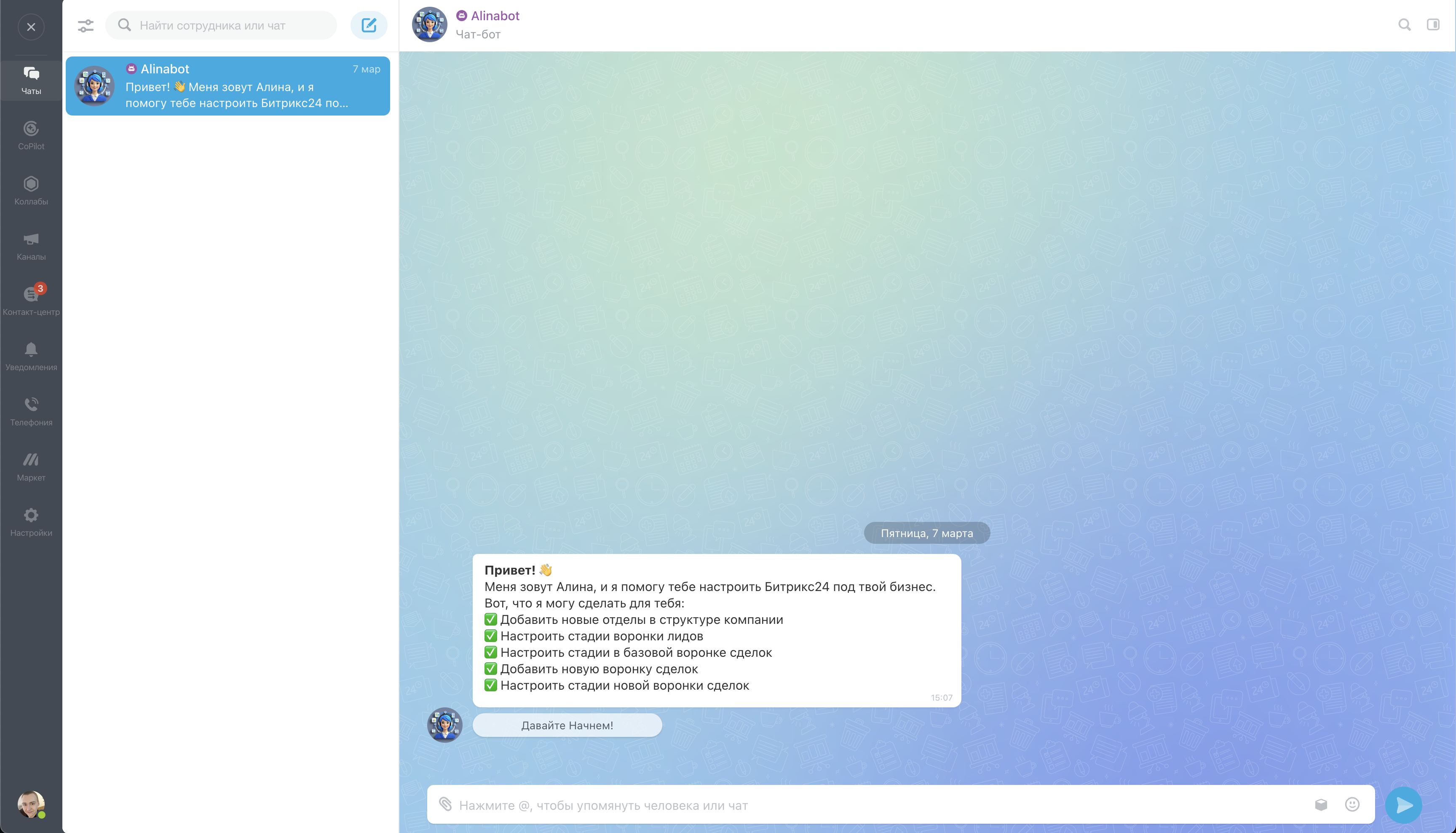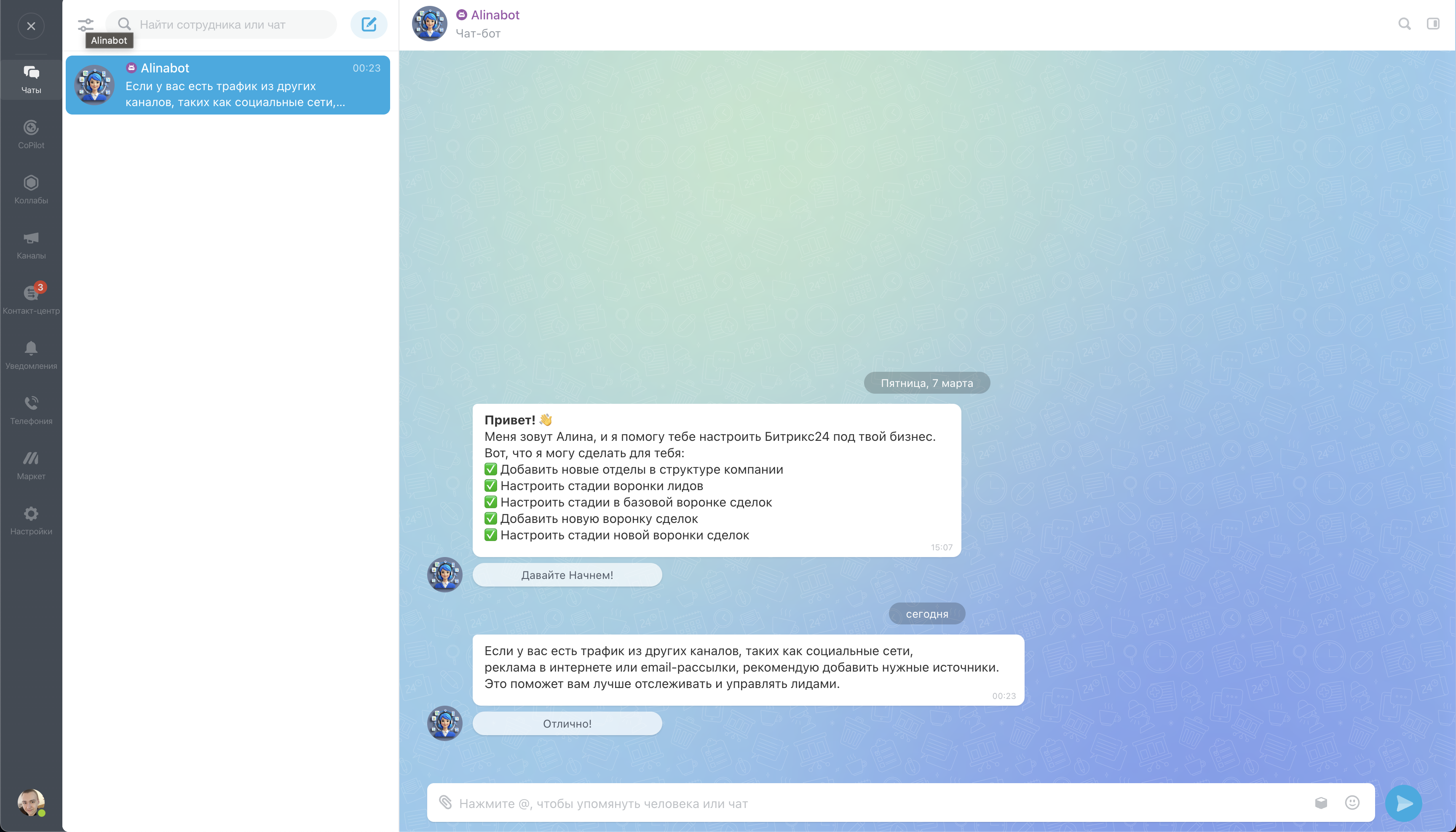 Алина — ваш помощник для автоматической настройки Битрикс24! Алина задает вопросы, анализирует ответы и создает CRM-систему за минуты. Больше не нужны инструкции или помощь IT-специалистов. Просто общайтесь с ботом — он сделает всю работу за вас!