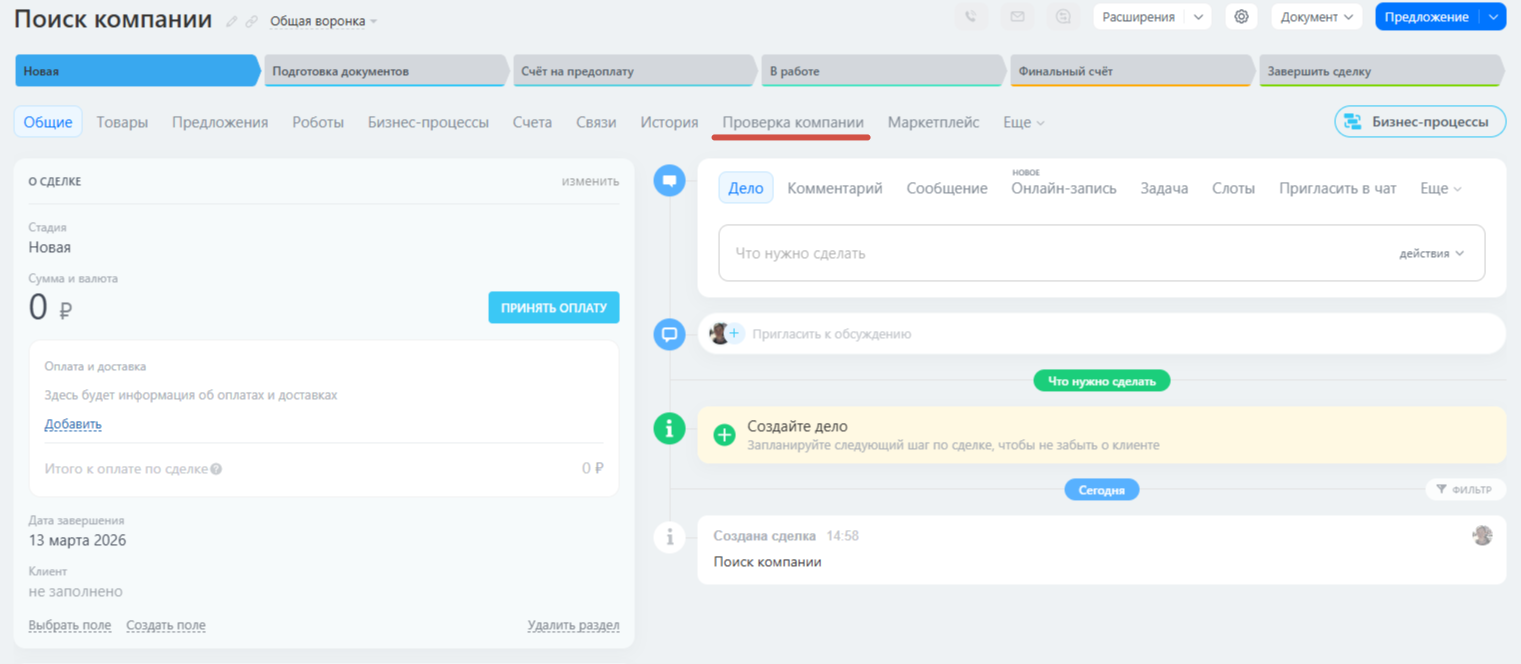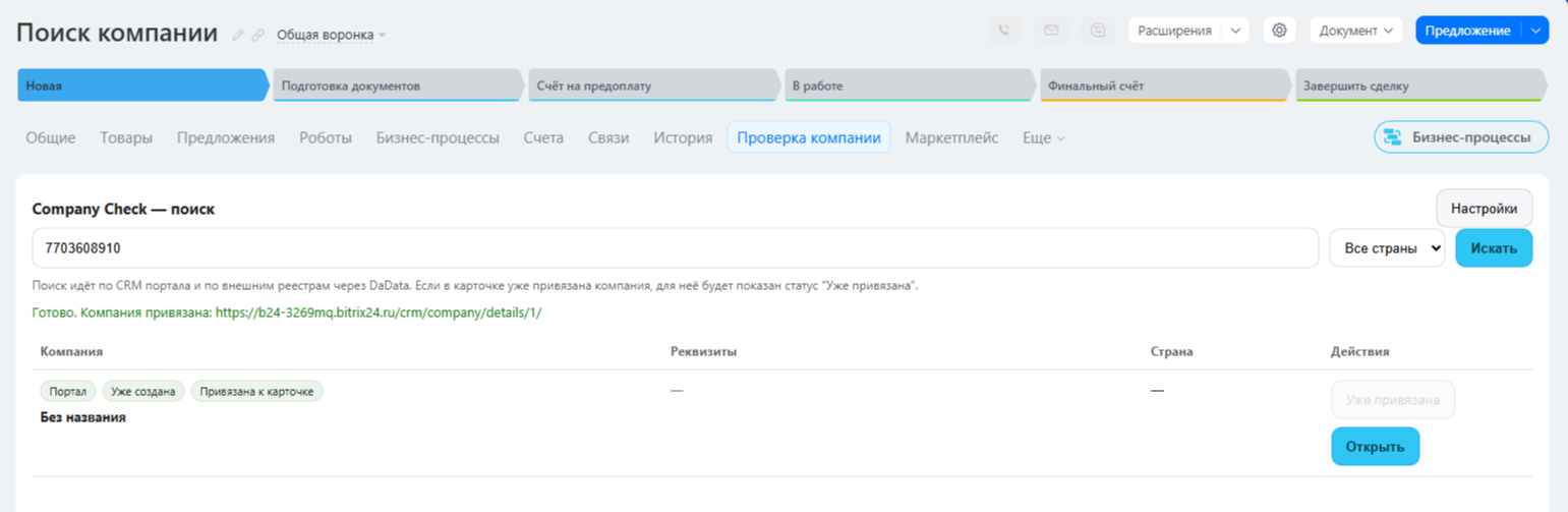 В карточке лида или сделки появляется вкладка/кнопка "Проверка компании”:
