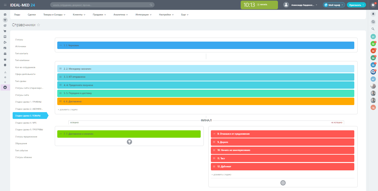 4. Сделка направление «Товары», стадии, участники и описание событий:
