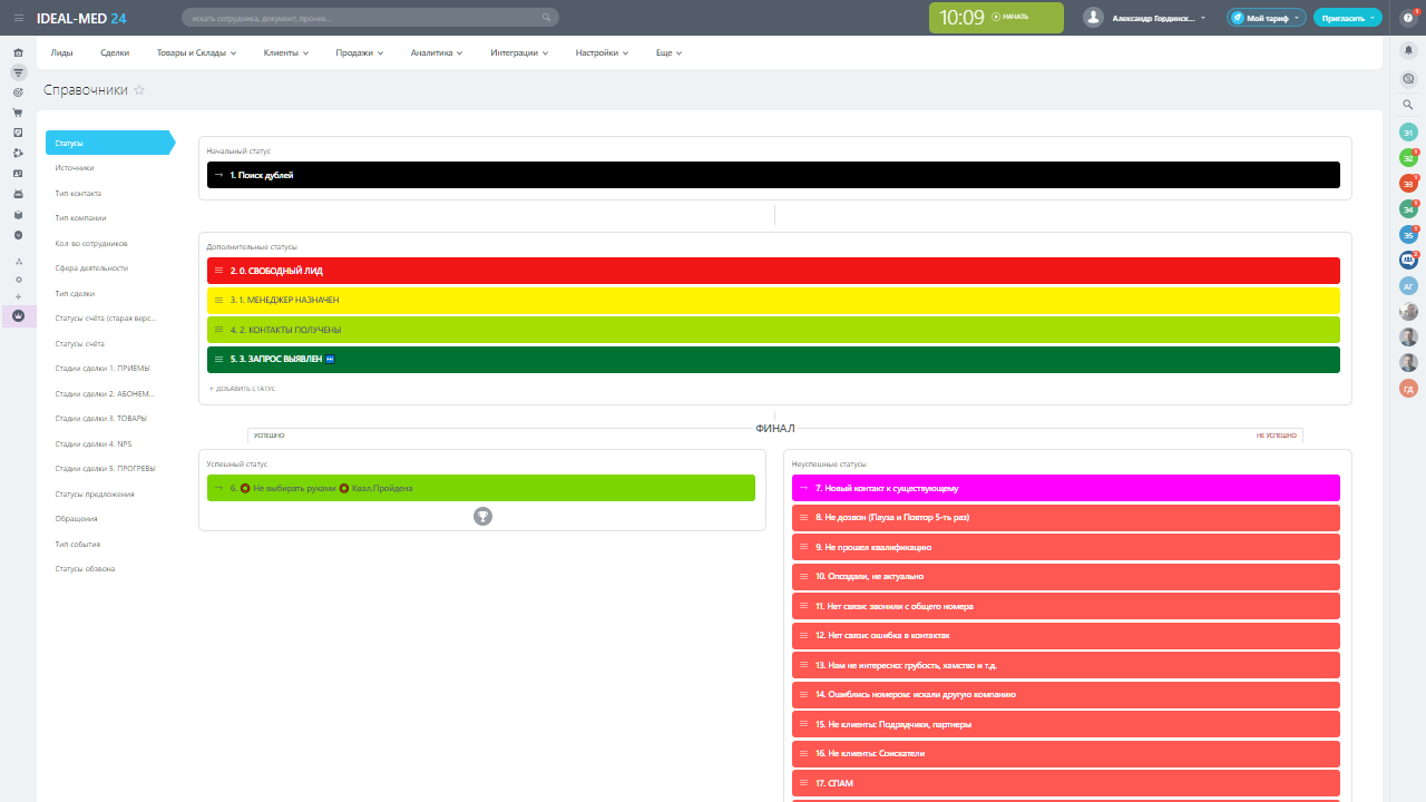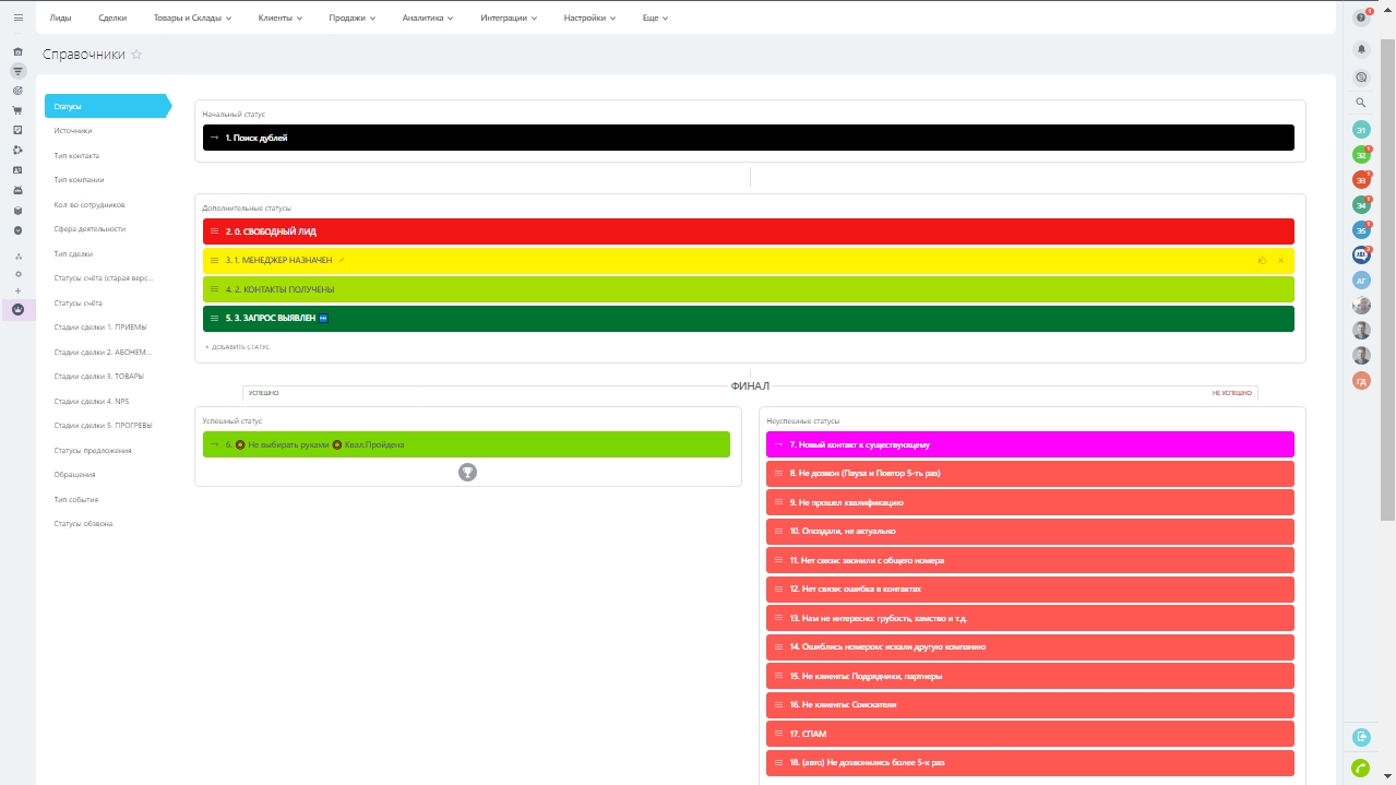 - Сделка (Статус «Свободная сделка» создаётся автоматически при успешном закрытии лида или вручную по необходимости.