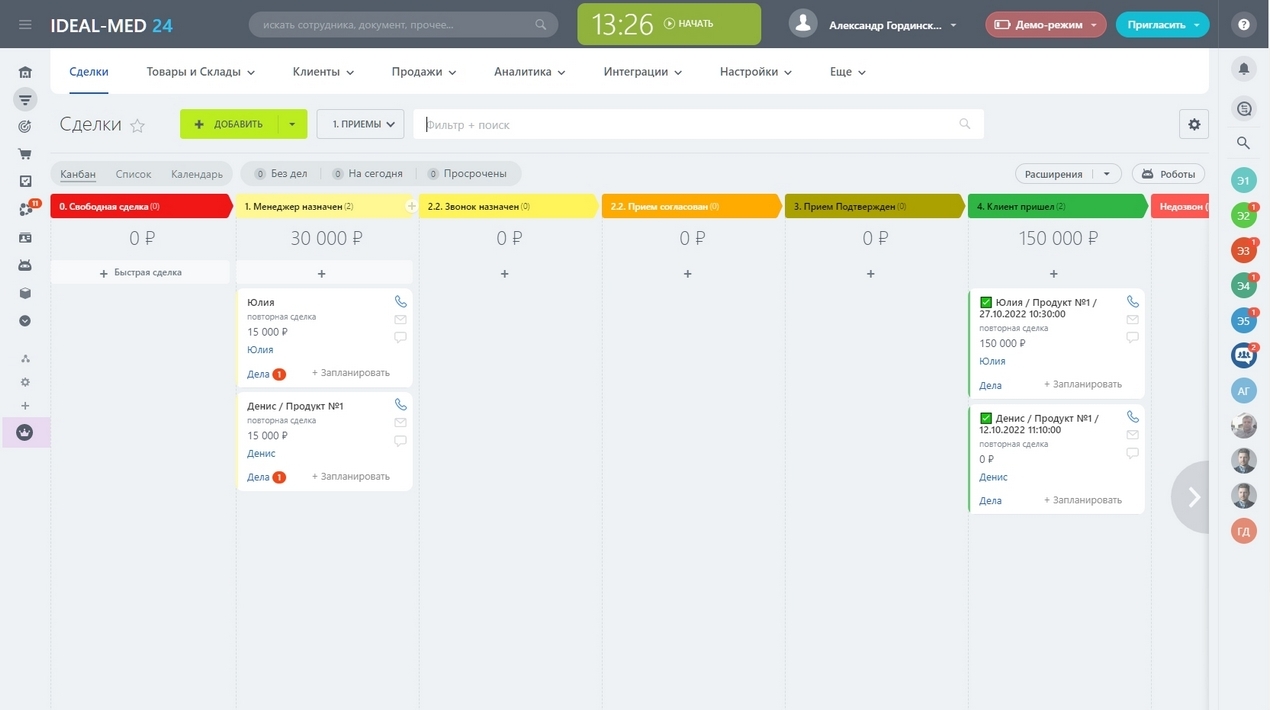 - Предоставляет в режиме онлайн информацию и отчеты руководителю отдела продаж и руководителю компании о всех активных клиентах, на какой стадии находятся их заказы, кто из менеджеров за что отвечает, как распределена нагрузка между сотрудниками, на каких этапах «зависли» продажи, чтобы своевременно сделать вывод и подтолкнуть все «заторможенные» процессы вперед.