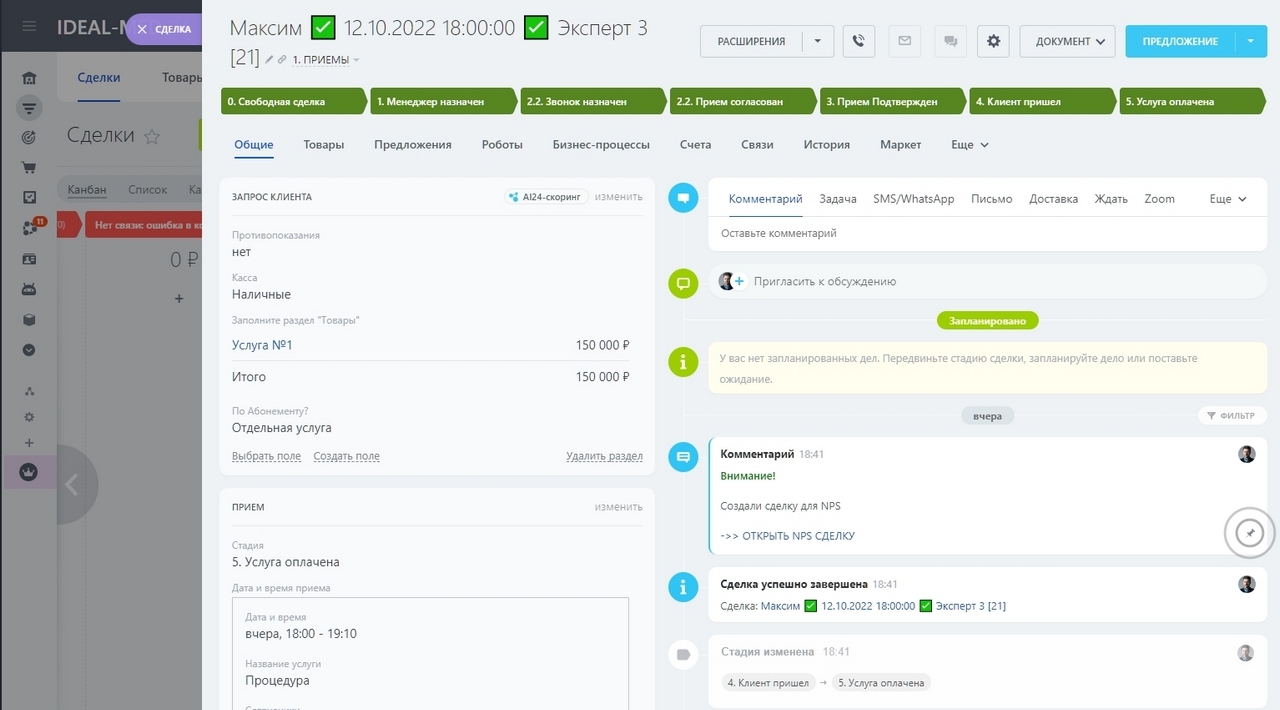 На стадии «Услуга оплачена» роботом создаётся сделка повторный «Приём» и сделка направления «NPS» и направления «Прогревы».