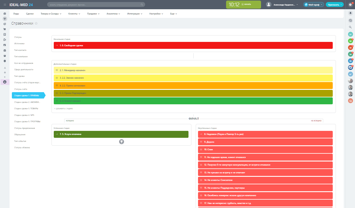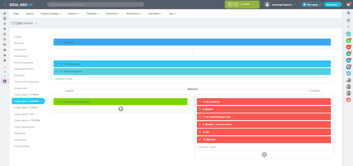 3. Сделка направление «Абонементы», стадии, участники и описание событий: