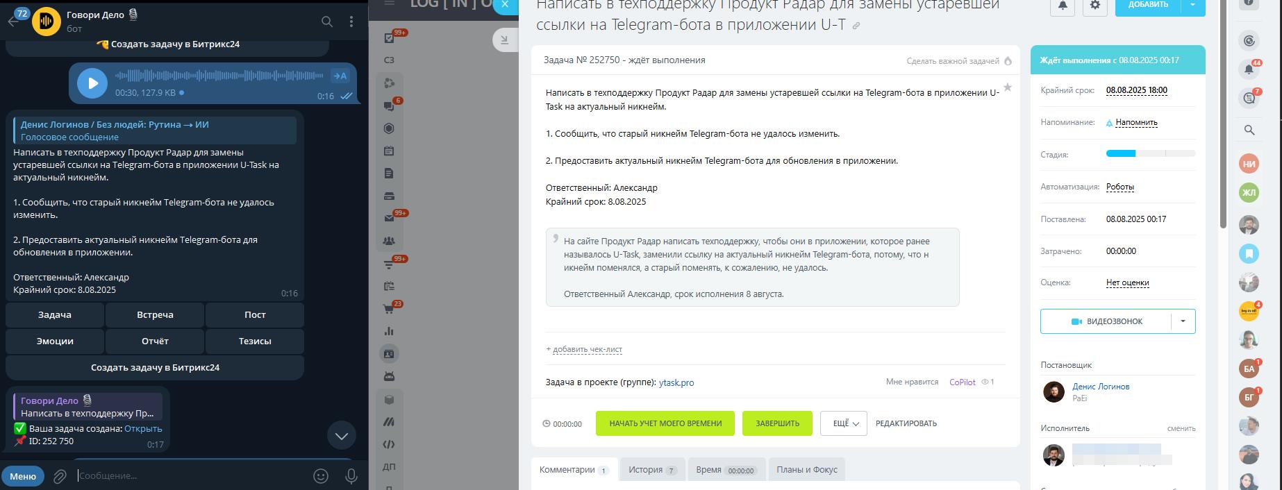 Для тех, кто устал: Писать задачи вручную, Слушать голосовые по 5 минут, Таскать тексты из Telegram в Битрикс24, Терять договорённости после встреч, И делать за других то, что должен делать сам сервис.