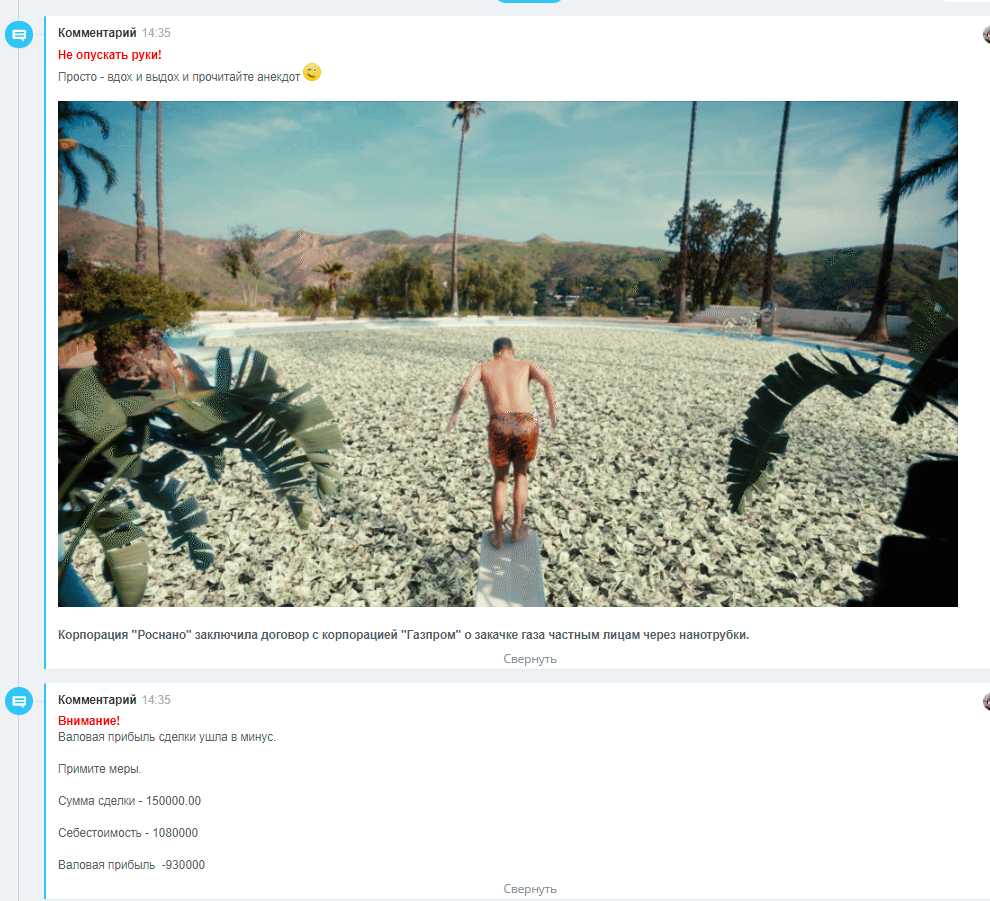 Информация о отрицательном балансе любого проекта или снижение порога рентабельности автоматически отображается в информационной части карточки сделки и уведомлениях сотрудникам. Дальше нужно принимать экстренные меры «спасения» проекта.