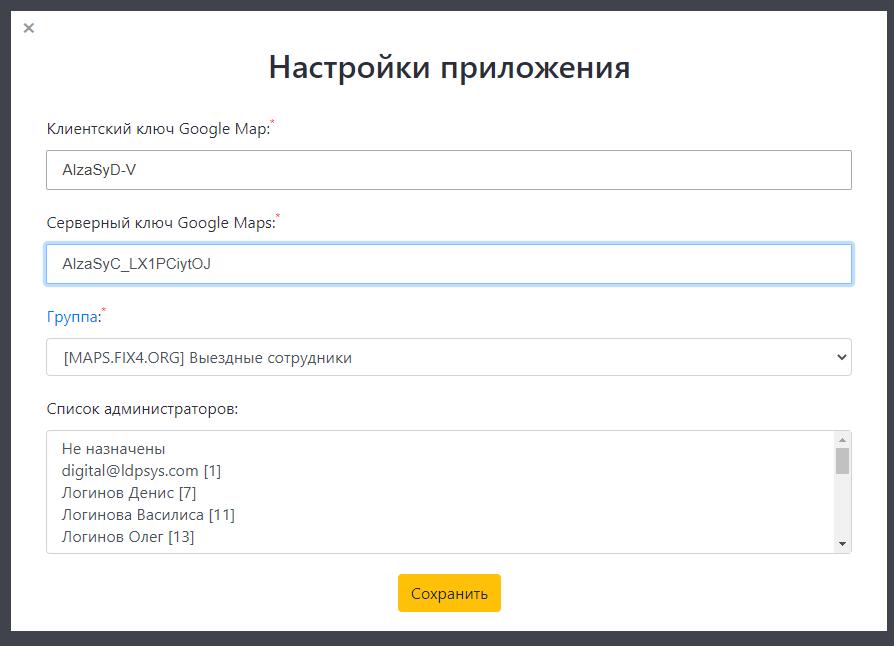 2. Укажите два ключа в настройках приложения. Они доступны только администратору. Без ввода ключей - интерфейс карт открываться не будет.