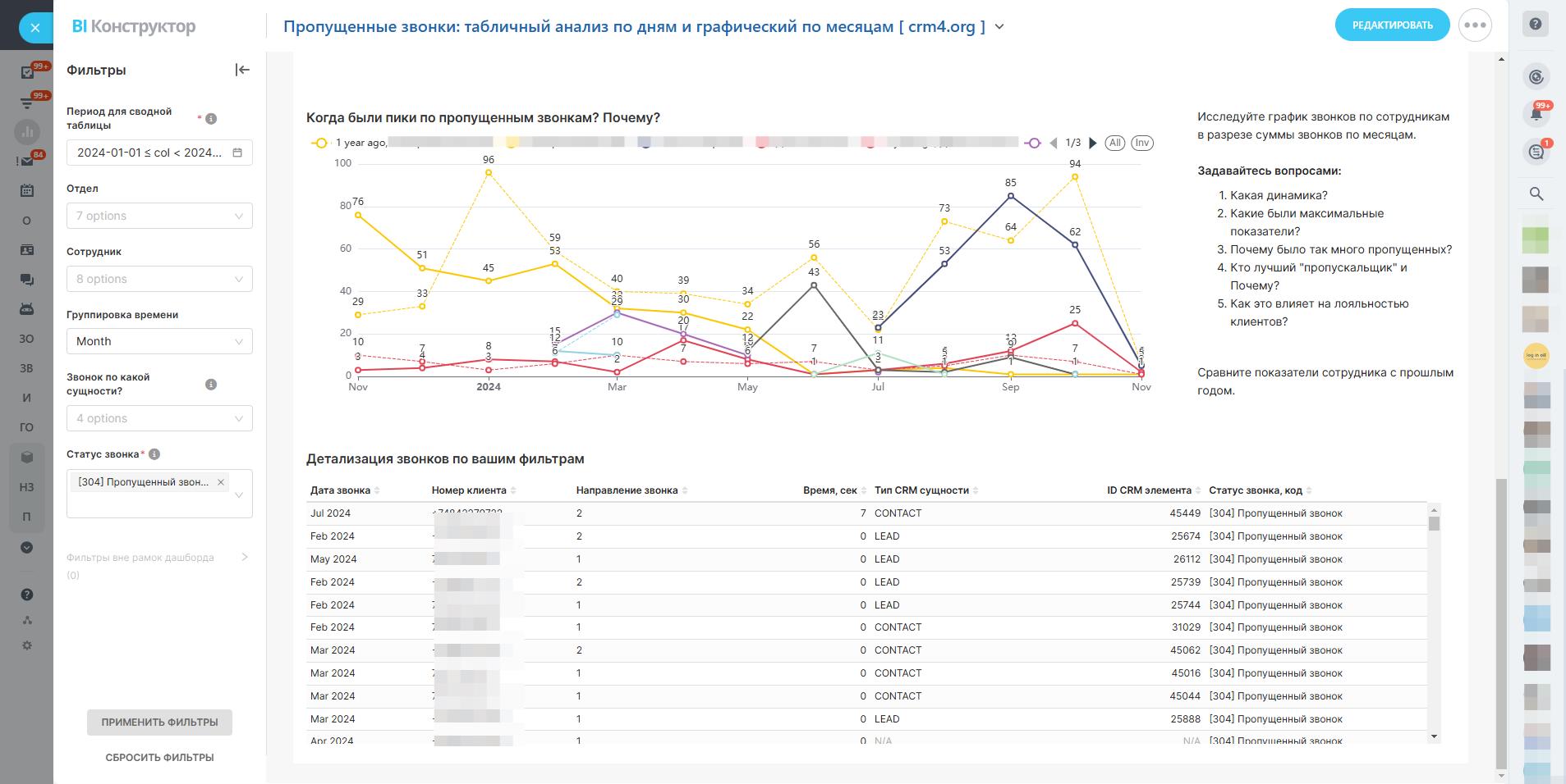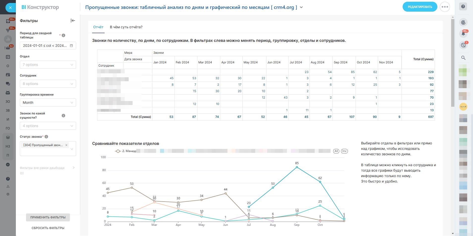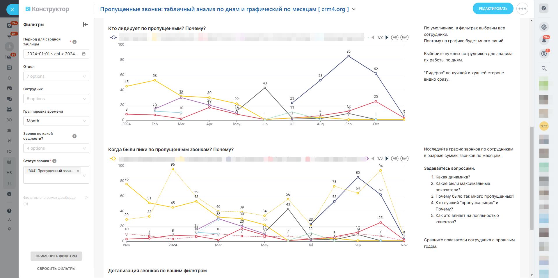 Смотрите на динамику звонков по сотрудникам в разрезе месяцев, исследуйте, какие показатели можно "победить", и задавайте себе вопросы: как изменить стратегию для достижения лучших результатов?