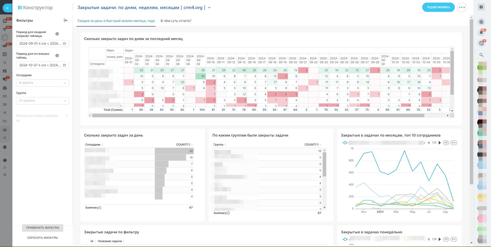 - Сколько закрыто задач по дням за последний месяц: Таблица с распределением завершенных задач по дням в течение последнего месяца. Цветовая индикация позволяет быстро выявить наиболее продуктивные и менее активные дни для каждого сотрудника. Это полезно для анализа рабочей нагрузки и выявления дней с перегрузкой или недостаточной активностью.