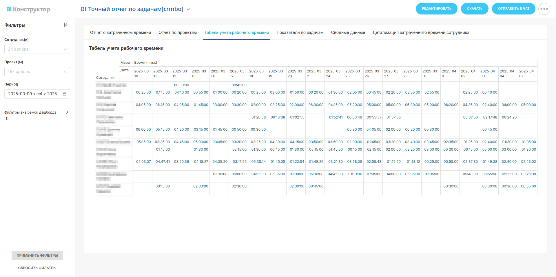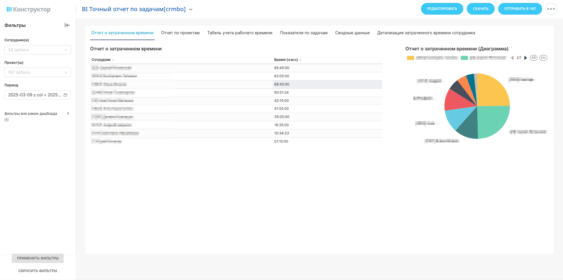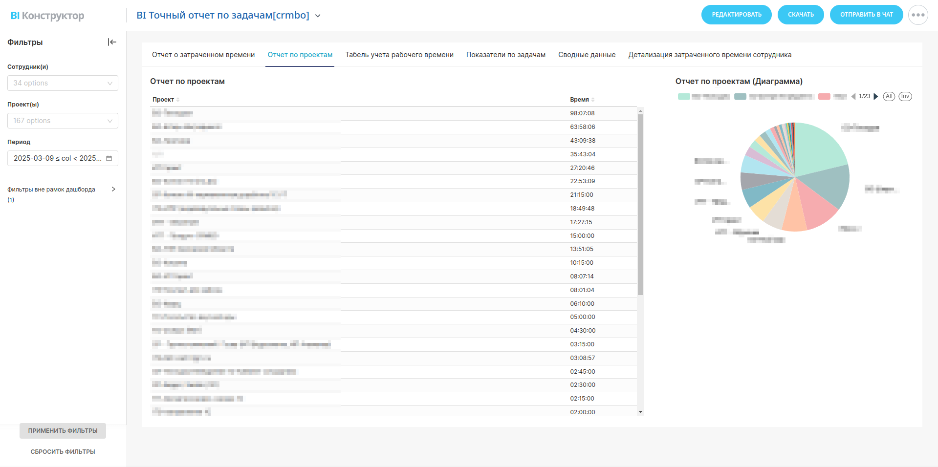 Анализ распределения времени между проектами. Помогает понять, какие проекты требуют больше ресурсов, а какие выполняются в рамках запланированного времени.Табель учета рабочего времени сотрудников