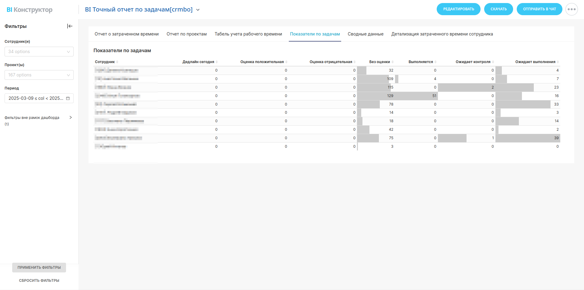 Детализированный учет рабочего времени каждого сотрудника. Позволяет отслеживать соблюдение рабочего графика и выявлять отклонения.Показатели по задачам сотрудников