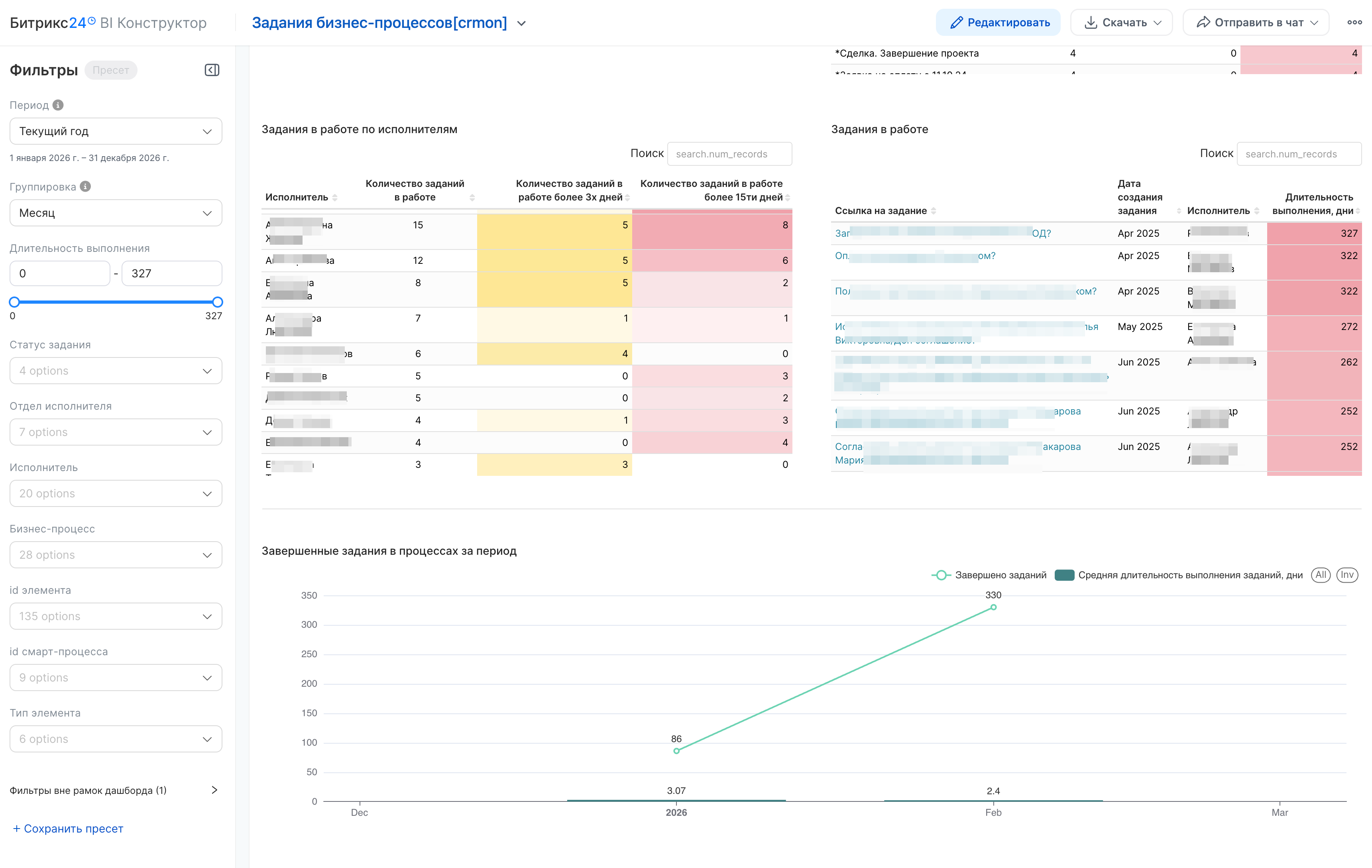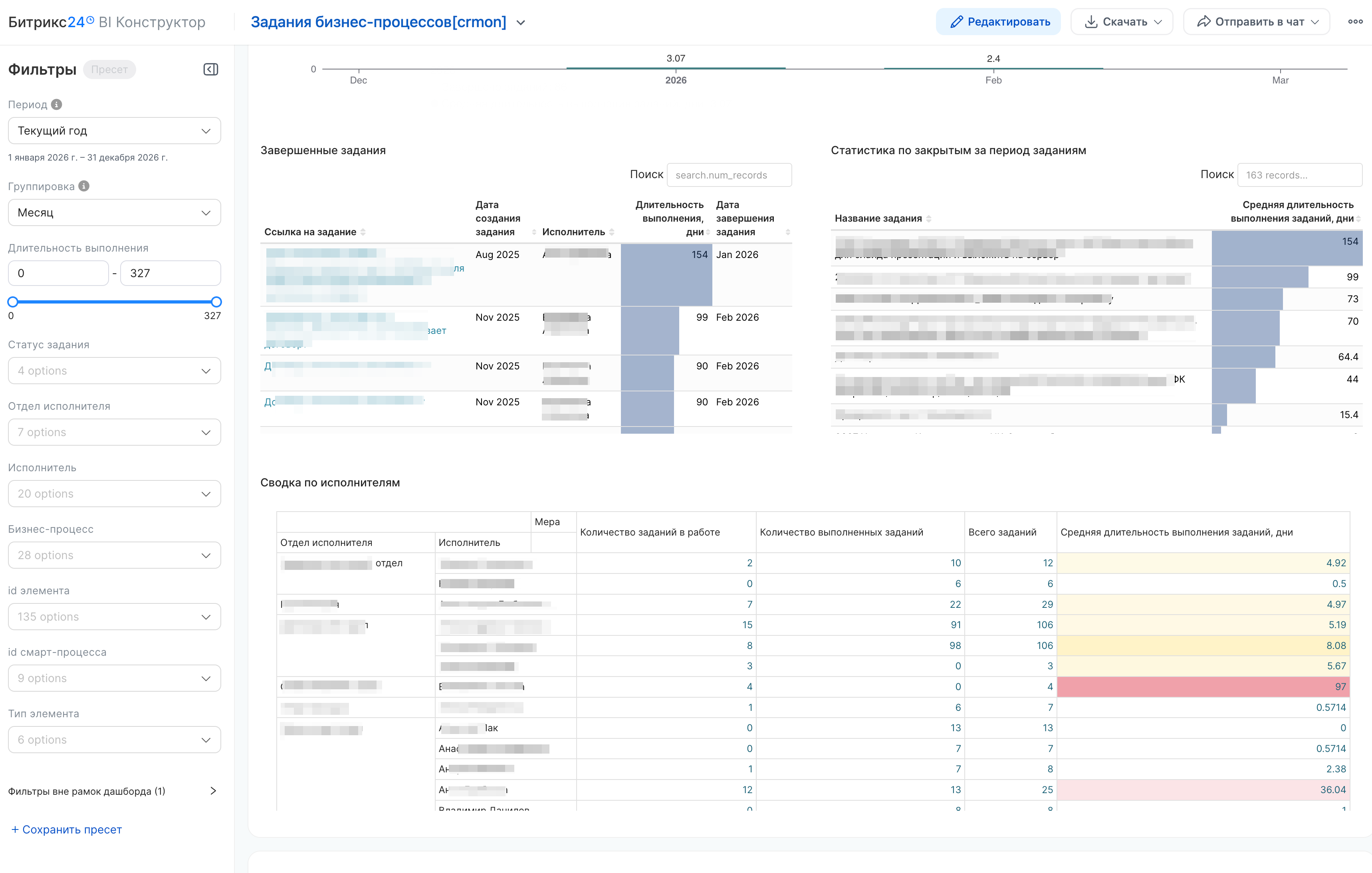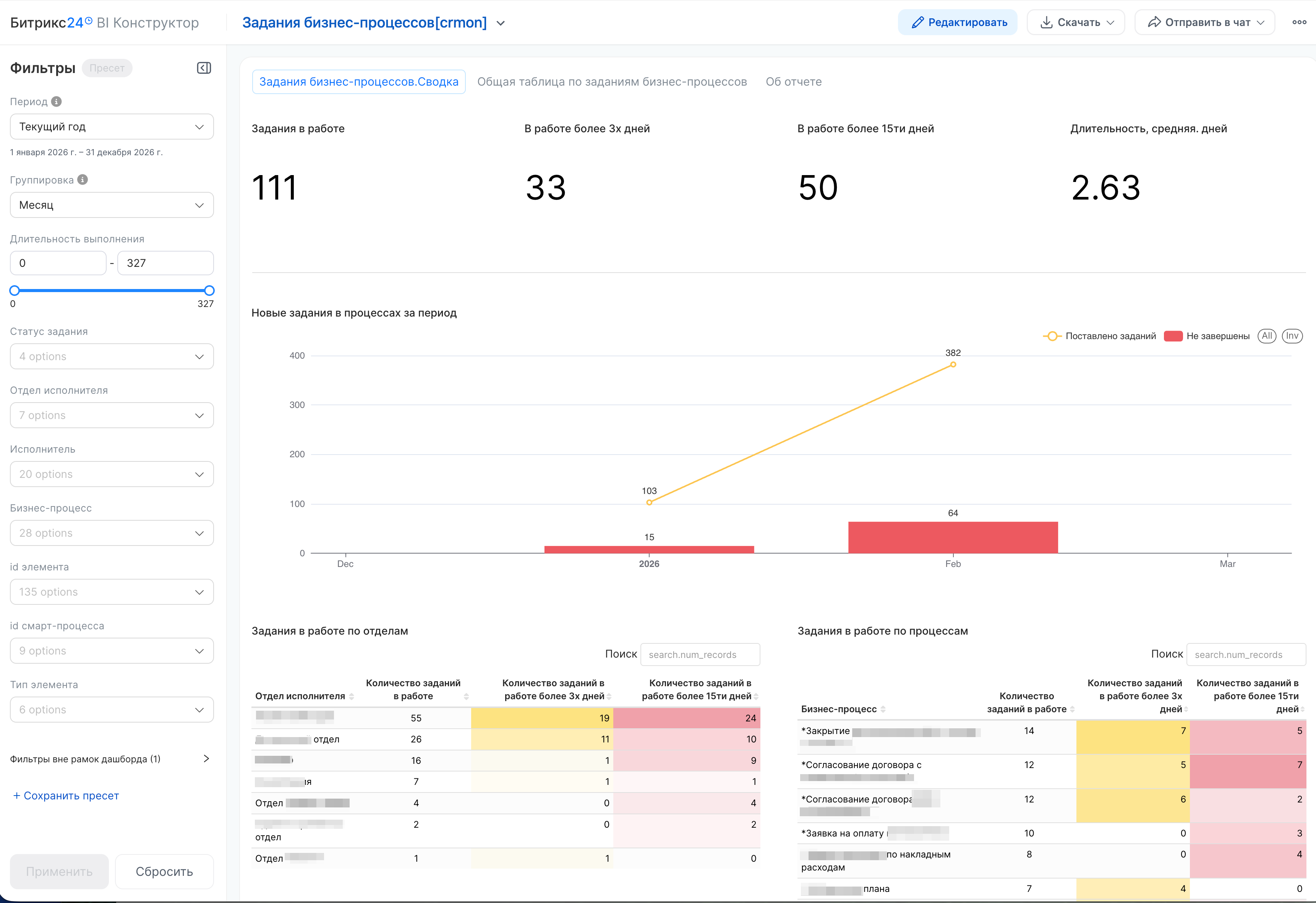 Задания по бизнес‑процессам и отделам — группировка для детального анализа.