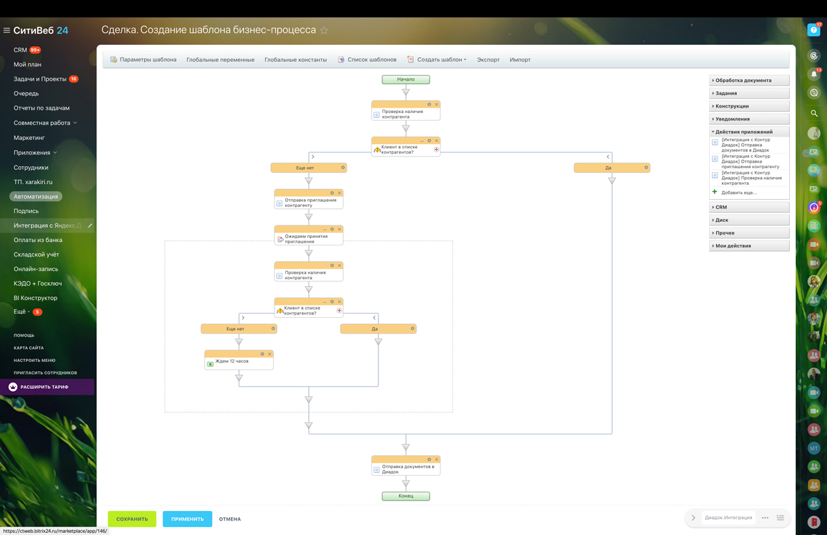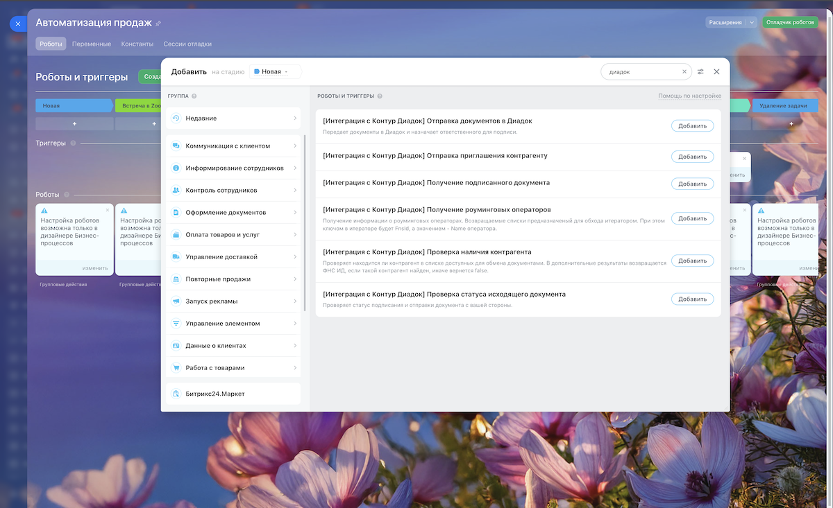 Интеграция Битрикс24 с Контур.Диадок — это полнофункциональный инструмент для внедрения ЭДО в бизнес-процессы Битрикс24 без доработок и кастомного кода. Приложение предоставляет 12 готовых Activity для роботов, поддержку роуминга с 30+ операторами ЭДО, подписание через КриптоПро прямо в браузере и детальное логирование всех операций. Подходит для построения сложных сценариев автоматизации, масштабируемых решений и проектов с несколькими юридическими лицами.