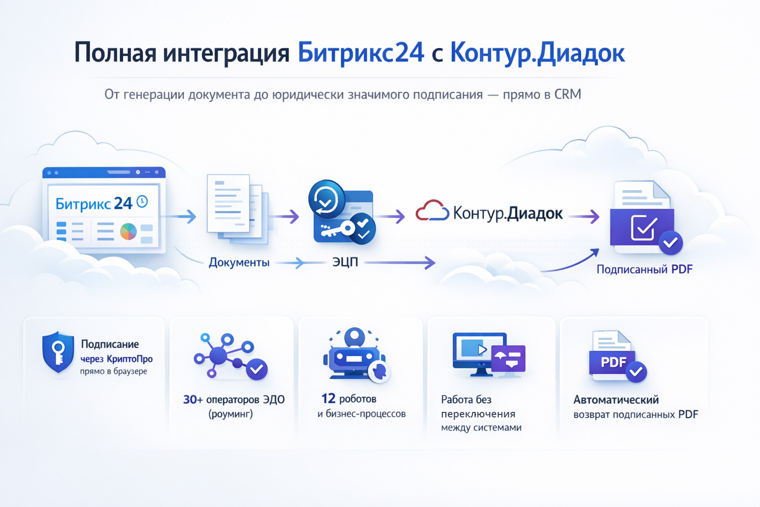 - Автоматическая загрузка подписанных PDF обратно в CRM