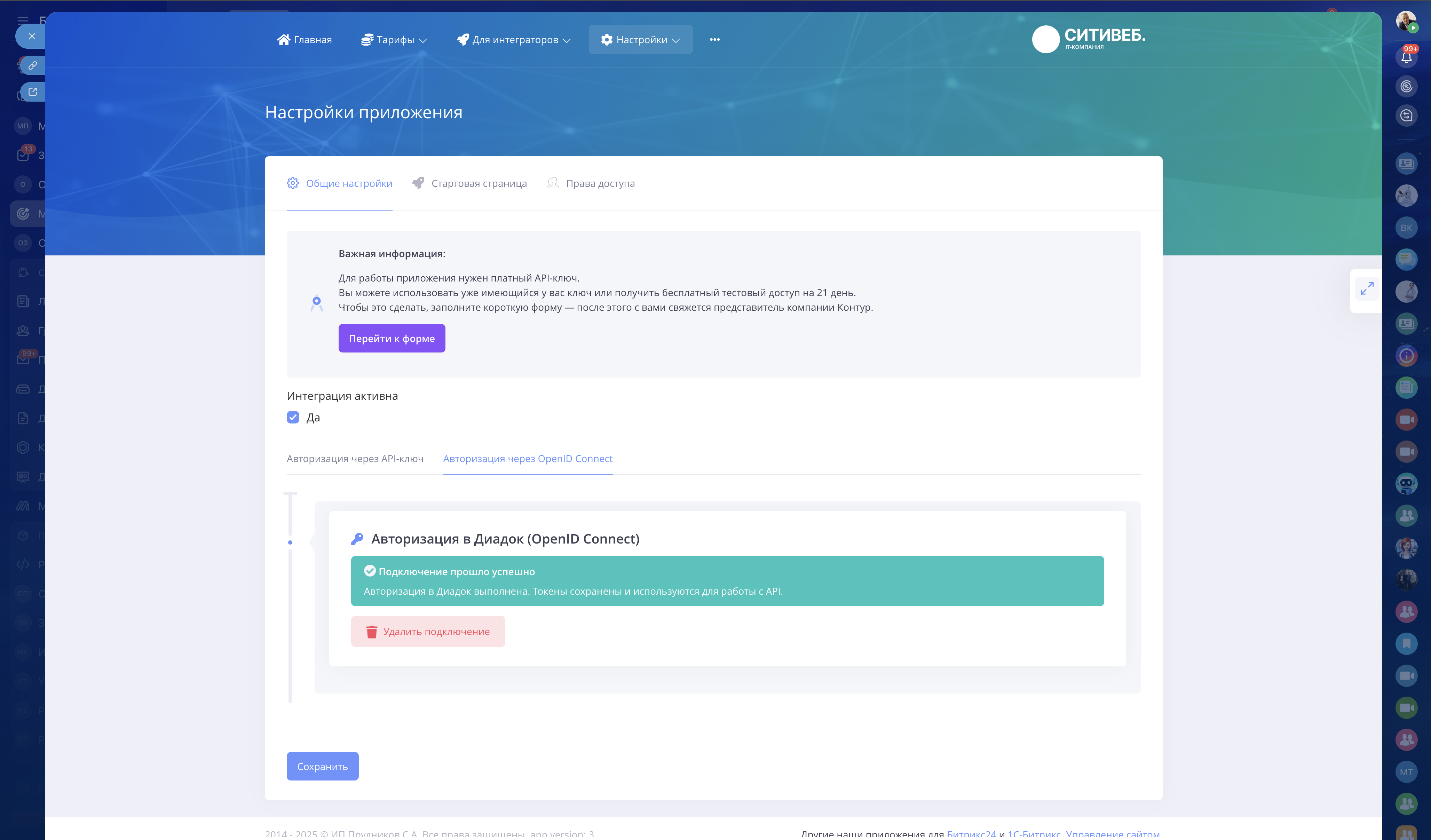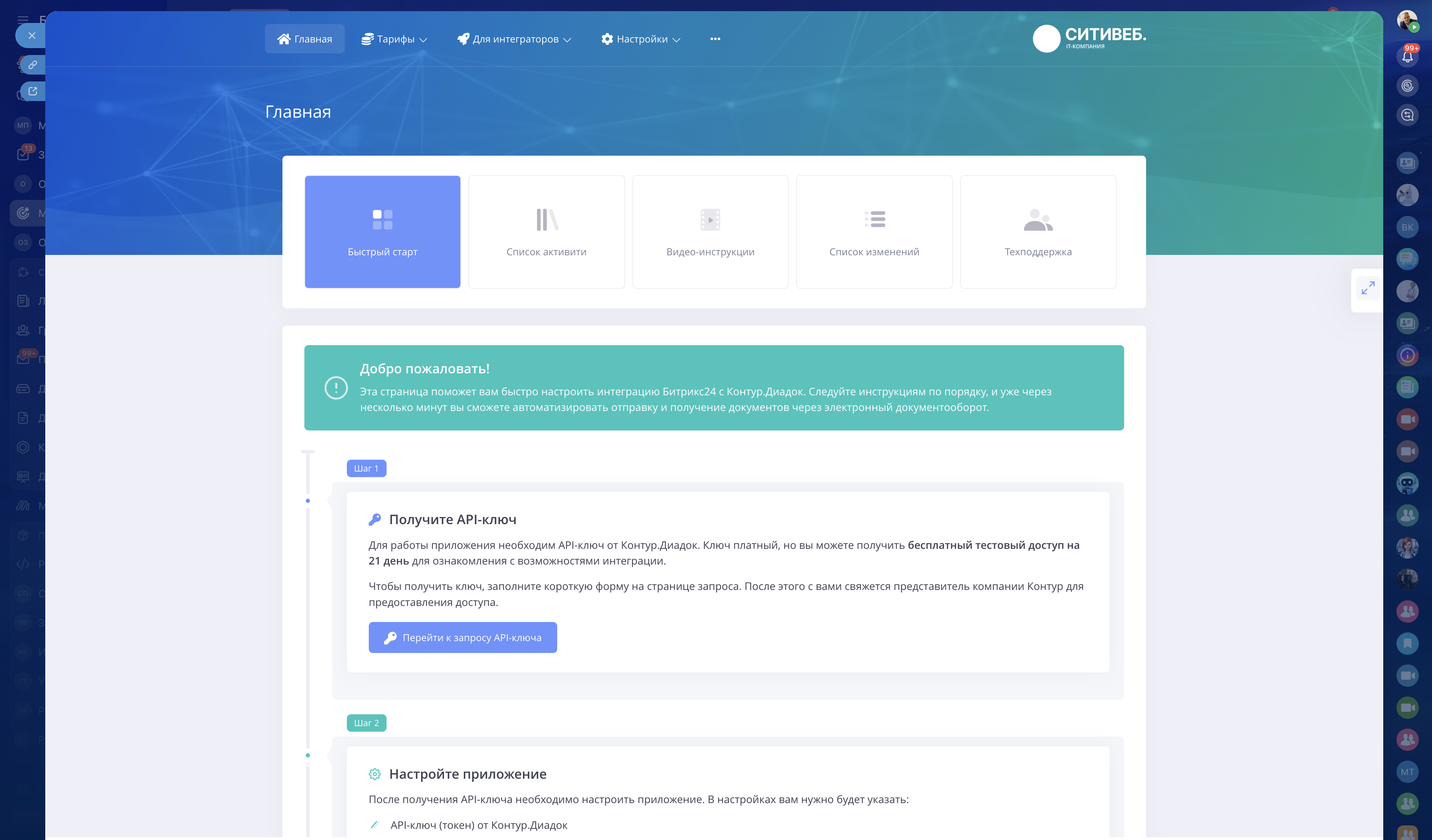 Для работы интеграции необходим API-ключ Контур.Диадок, который приобретается отдельно в Контуре.