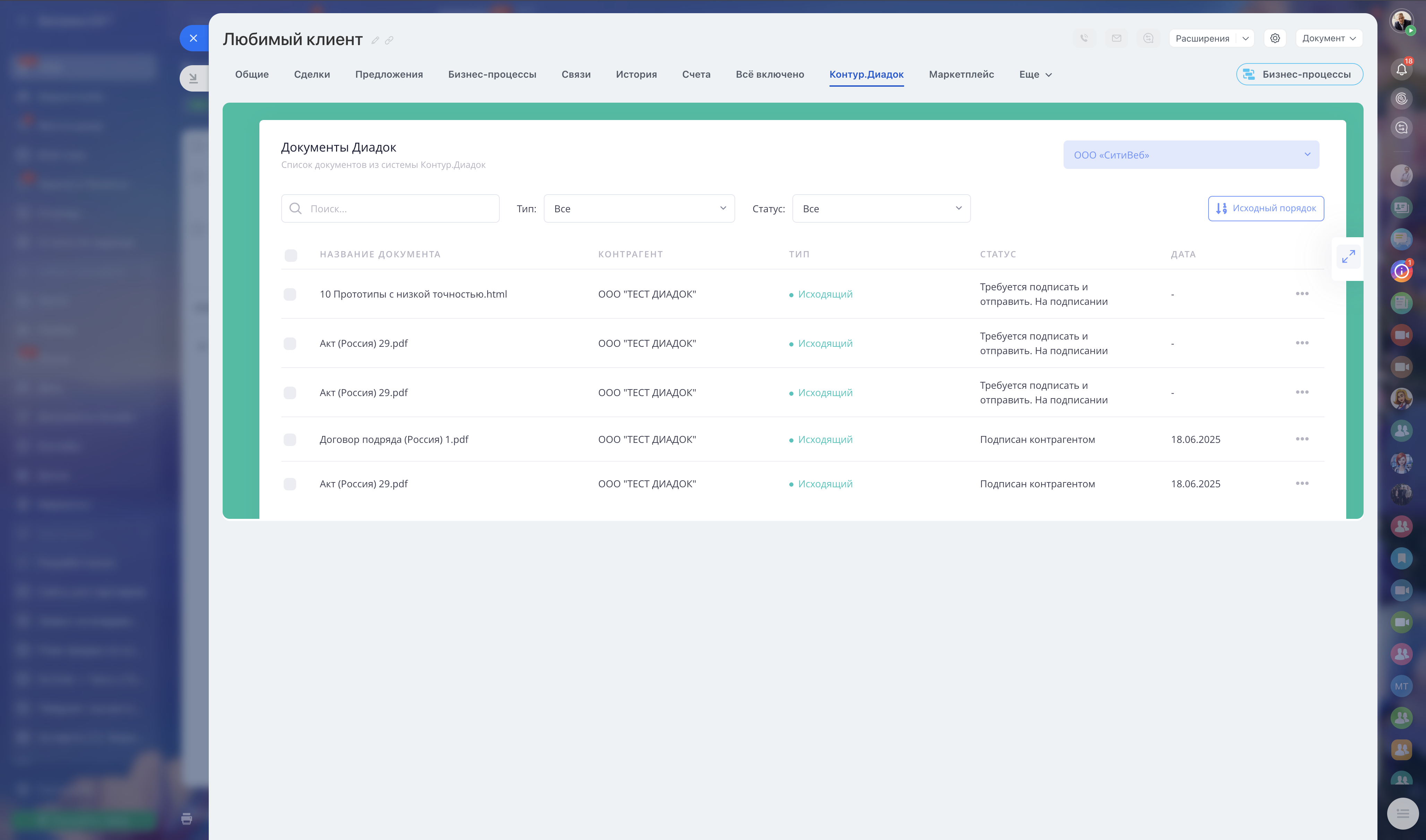 Документы сами падают в диадок, а менеджеры могут посмотреть статус подписания документов в любой момент.