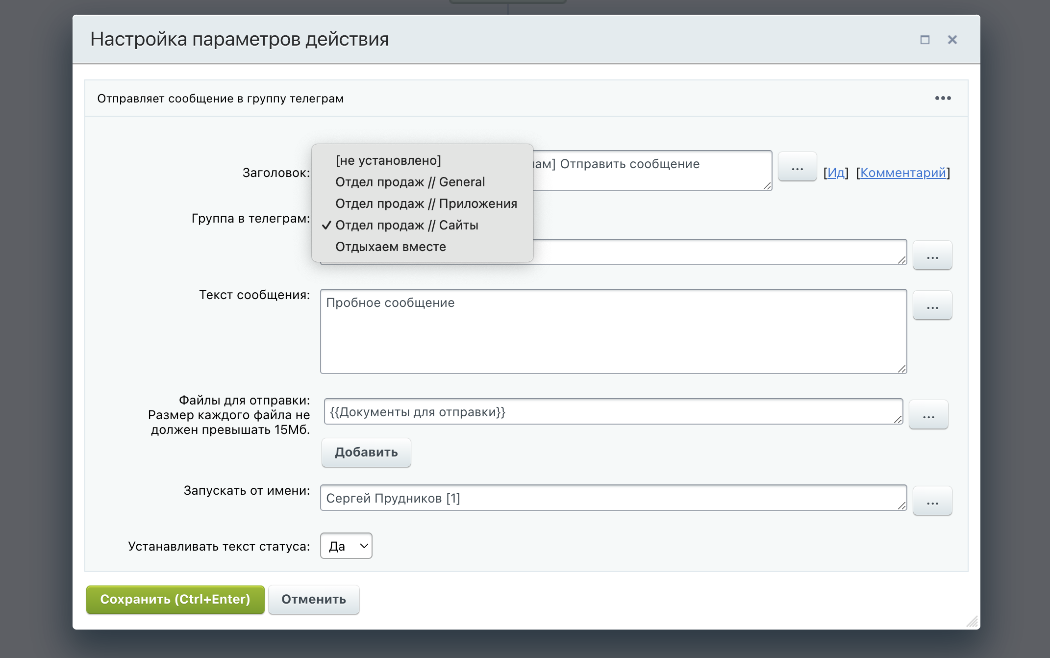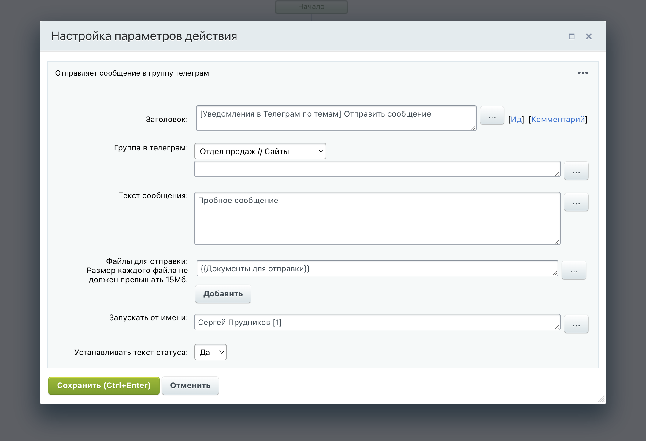 Основные возможностиОтправка уведомлений в Telegram — автоматические сообщения из бизнес-процессов Битрикс24 направляются в указанные группы или личные чаты.