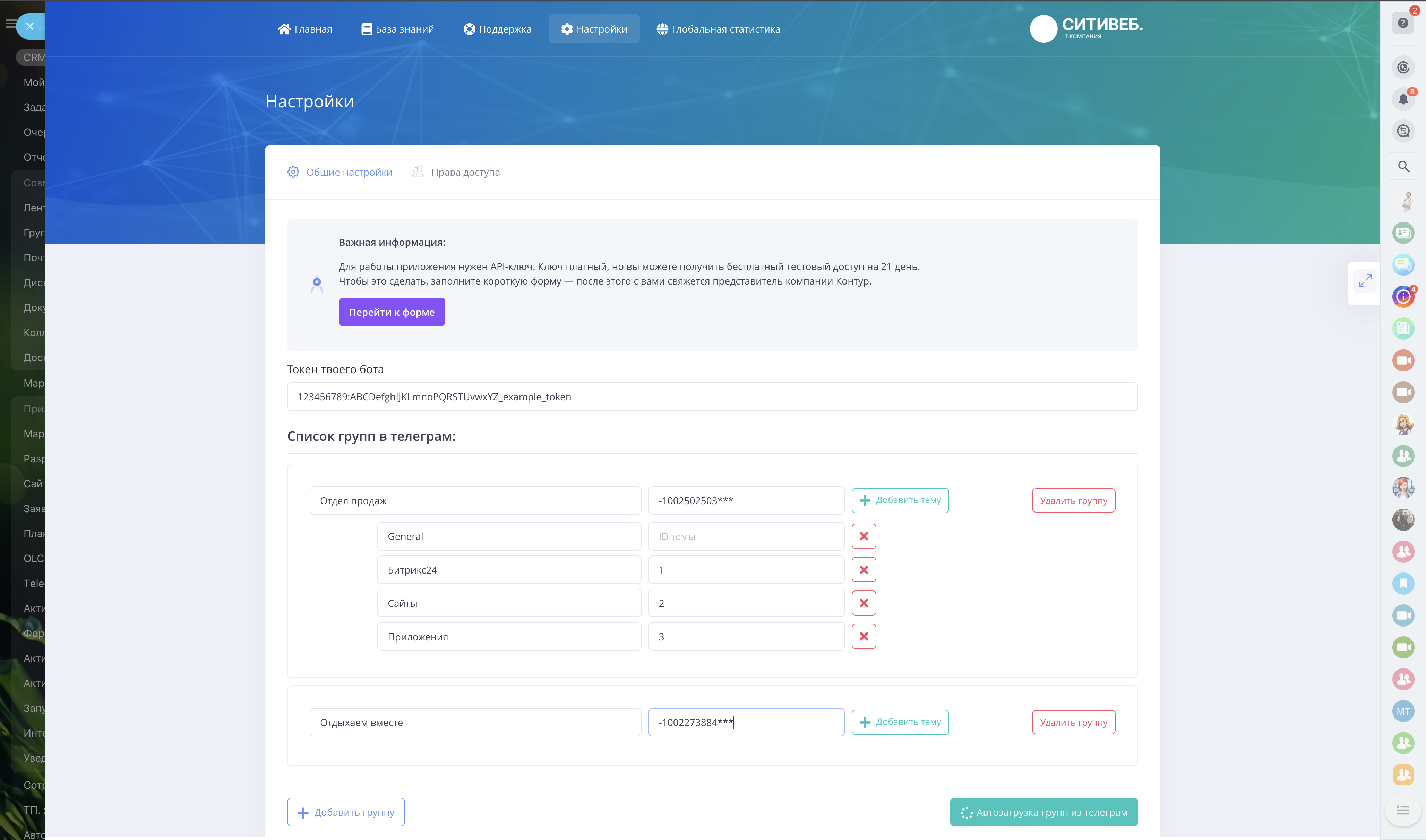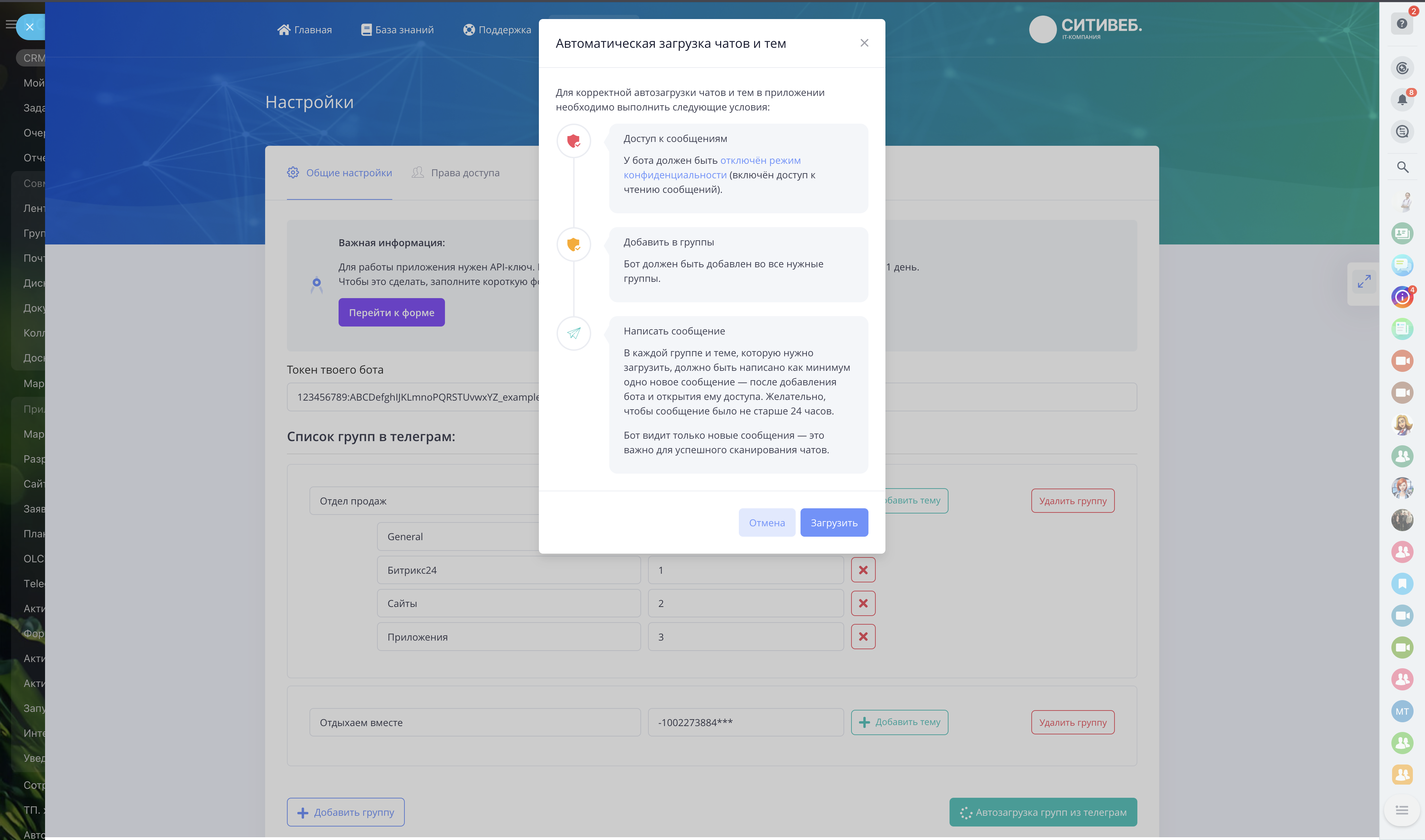 Это приложение позволяет легко и гибко настроить автоматическую отправку уведомлений из вашей CRM-системы Битрикс24 напрямую в мессенджер Telegram — в нужные чаты, группы и даже в тематические ветки сообщений.