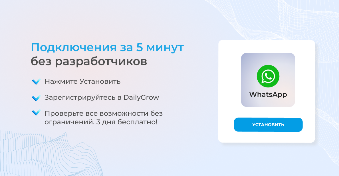 DailyGrow - приложение для интеграции WhatsApp и Битрикс24 позволяет объединить возможности популярного мессенджера с функционалом вашей CRM-системы. Подключение за 5 минут без разработчиков и бесплатное тестирование сервиса.