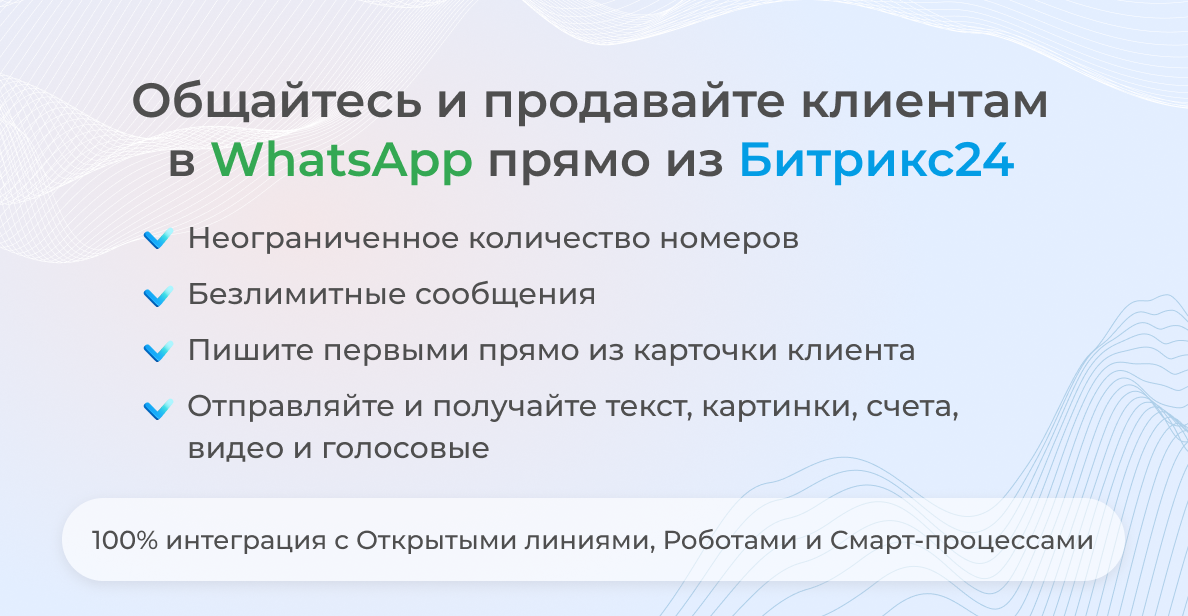 Подключение WhatsApp к Битрикс24 позволяет интегрировать WhatsApp с вашим аккаунтом в Битрикс24, пишите первыми из CRM, полная интеграция с открытыми линиями, передача файлов, голосовых сообщений и все возможности автоматизации.
