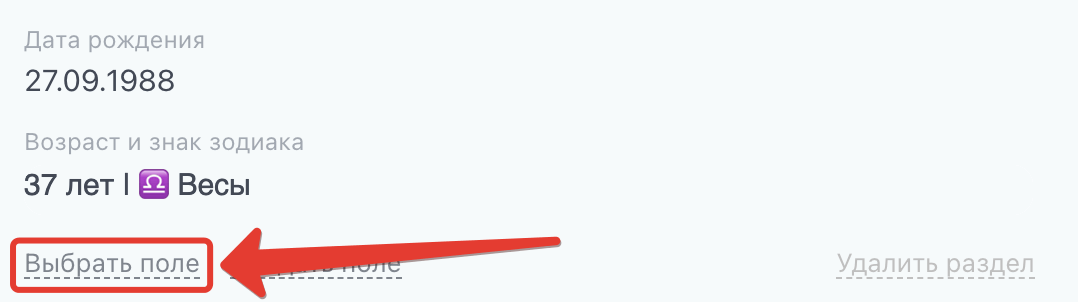Поле «Возраст и знак зодиака» отображает понятное значение возраста и знак зодиака.