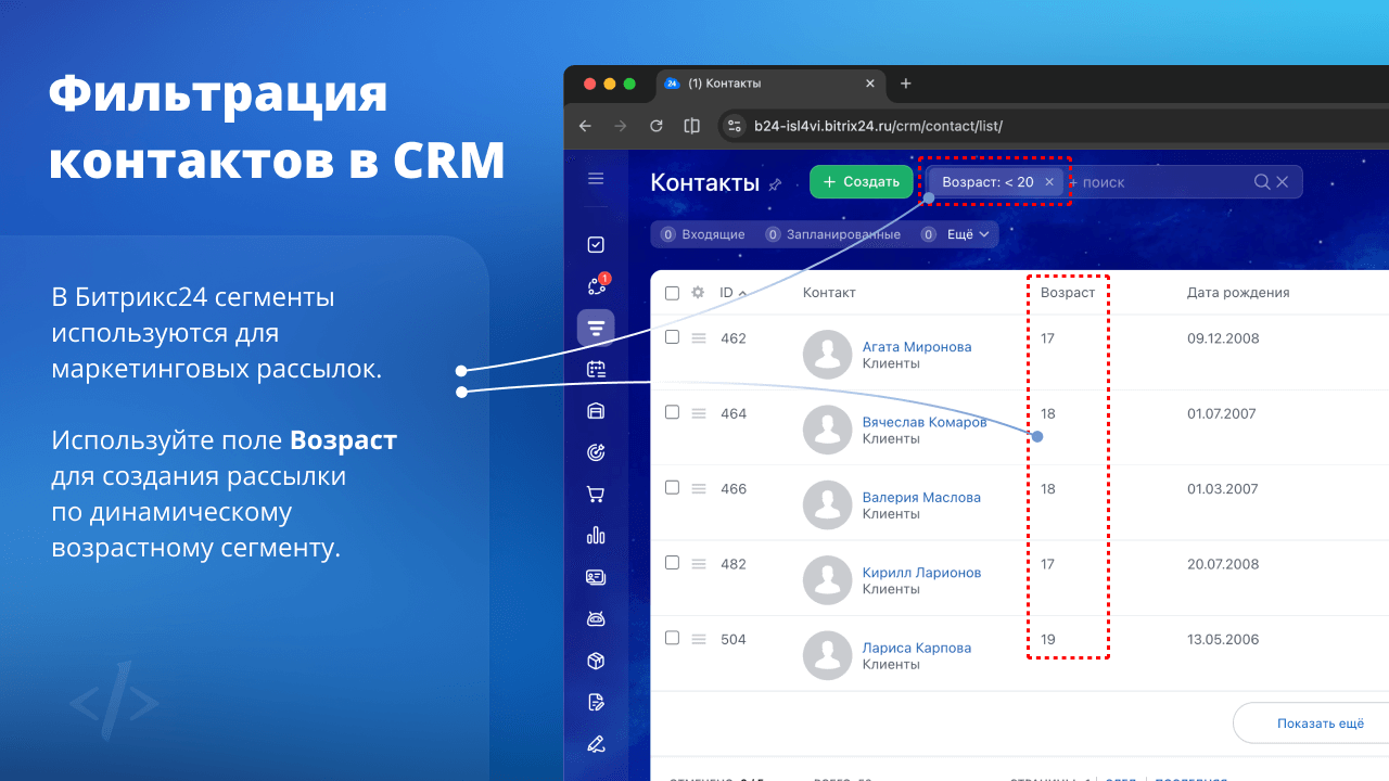 Поле «Возраст для сегментации» предназначено для аналитики и массовых сценариев: фильтрации контактов, построения выборок и создания сегментов рассылок по возрастным группам.