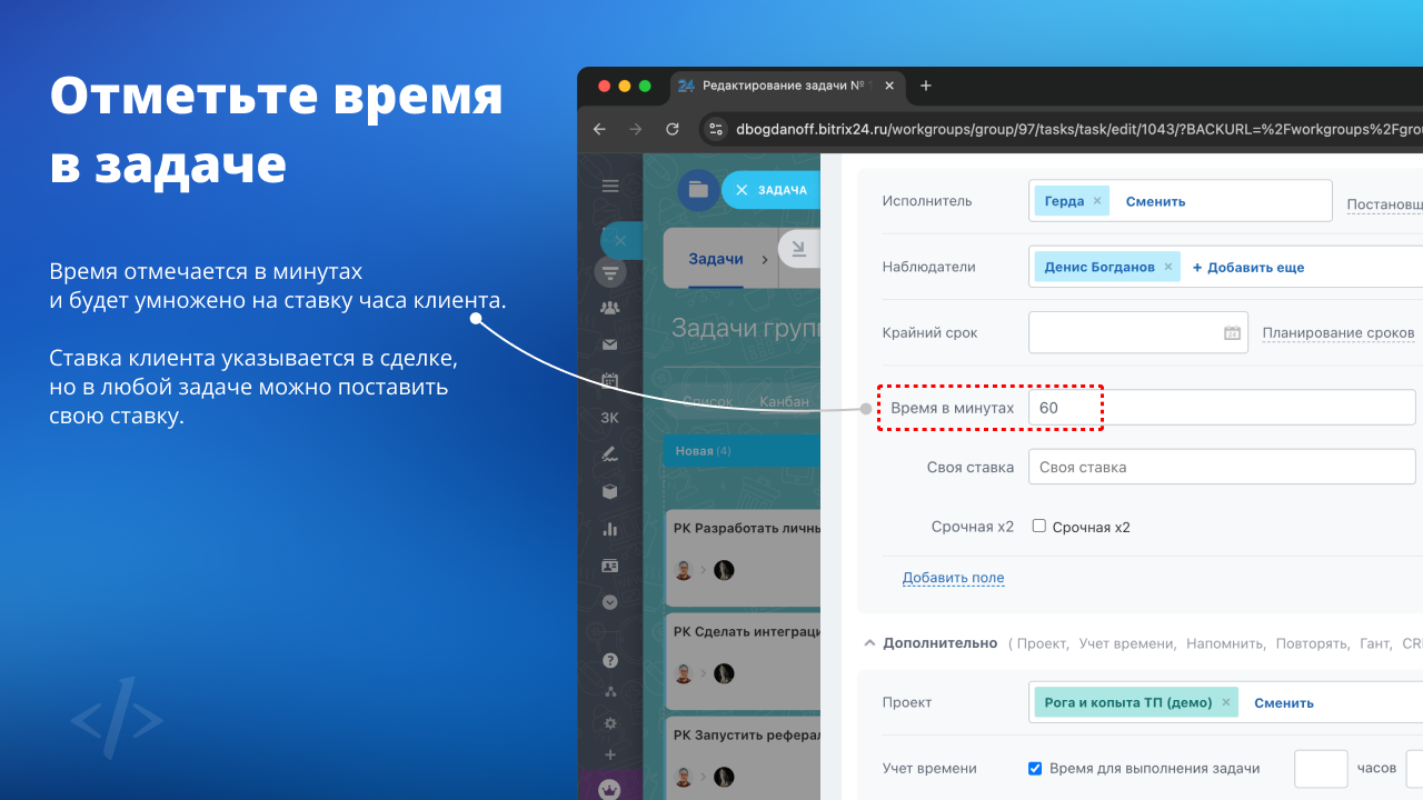 Сумма задолженности рассчитывается с учётом оплаченных счетов и закрытых задач по ставке указанной в сделке по конкретному клиенту, при этом в каждой задаче можно указать индивидуальную ставку. Также в задачах имеются следующие настройки: