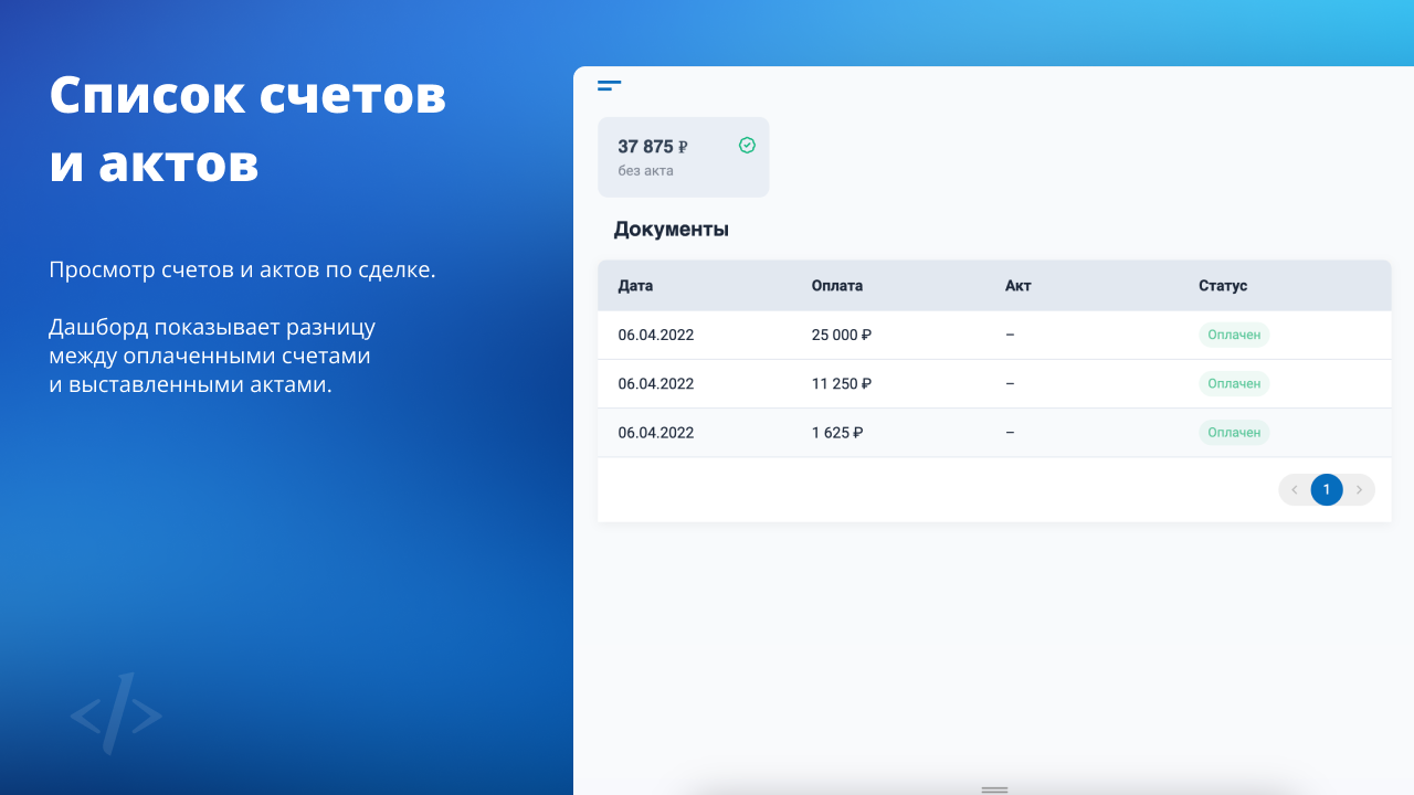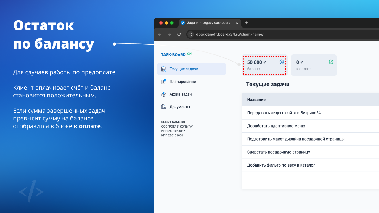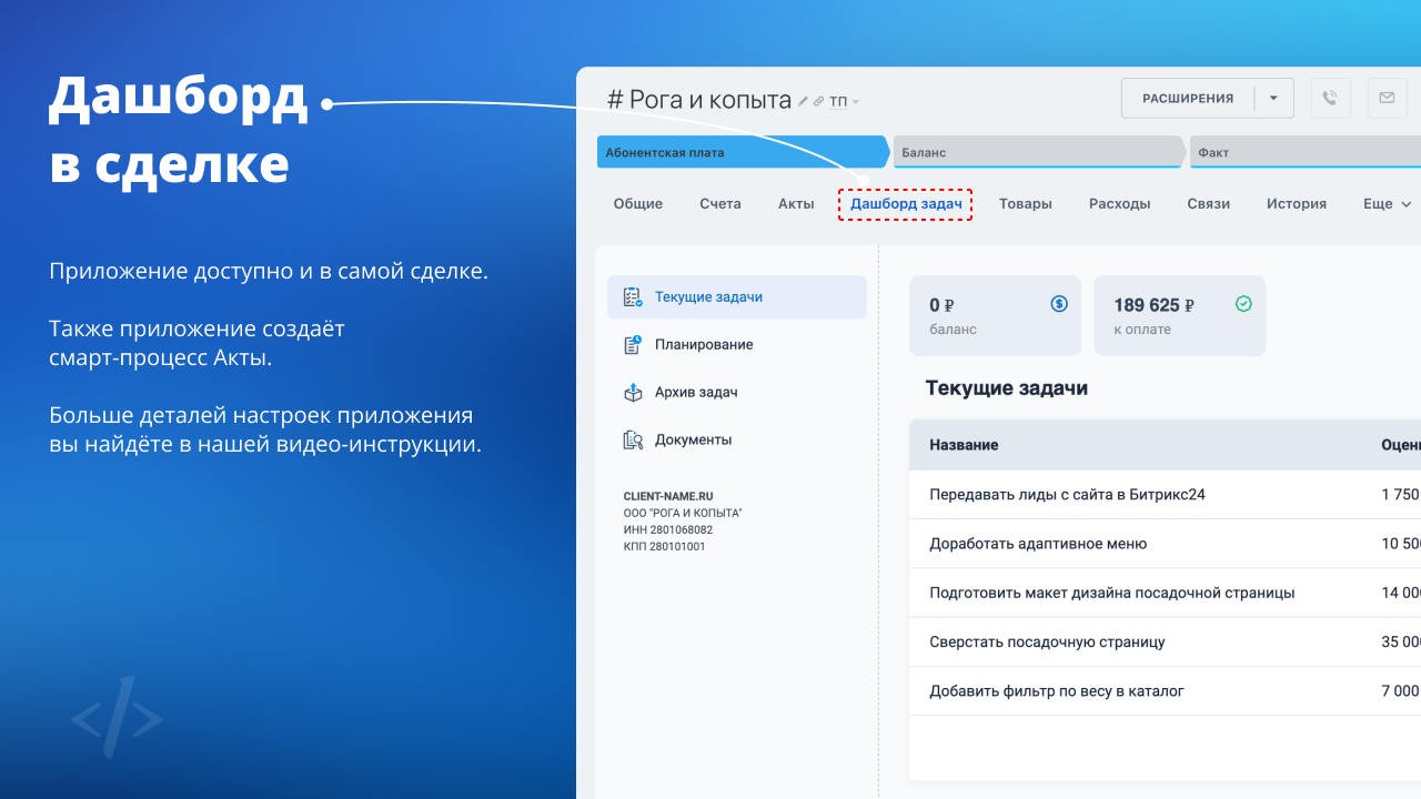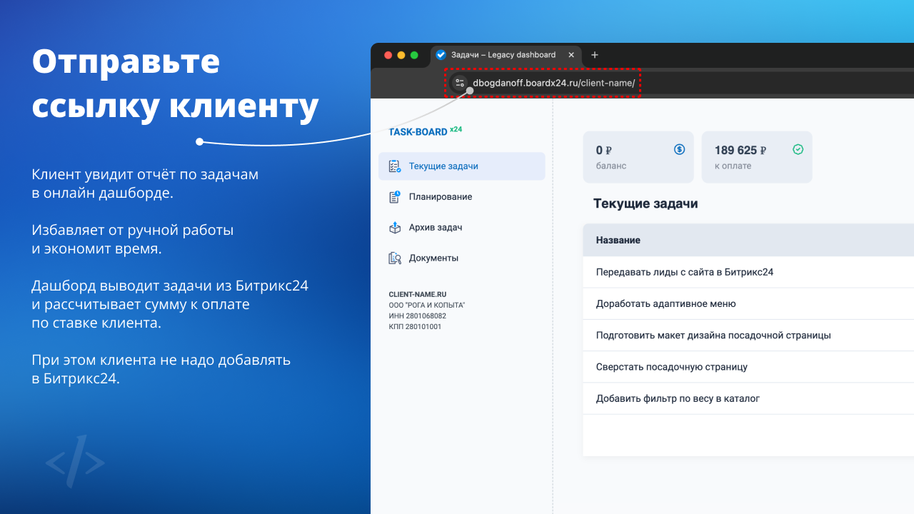 Приложение выводит во внешнюю ссылку список задач из вашего Битрикс24 с суммой задолженности по указанной ставке и списком счетов/актов. Ссылку можно отправить клиенту и избавиться от необходимости вручную подготавливать отчётность.