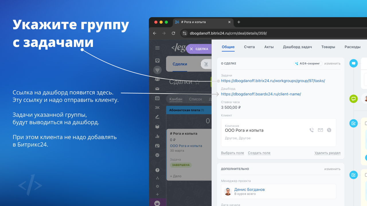 Ссылку можно отправить клиенту и освободиться от необходимости регулярной, ручной подготовки отчетности, так как он строится в режиме реального времени, получая данные прямо из вашего Битрикс24.