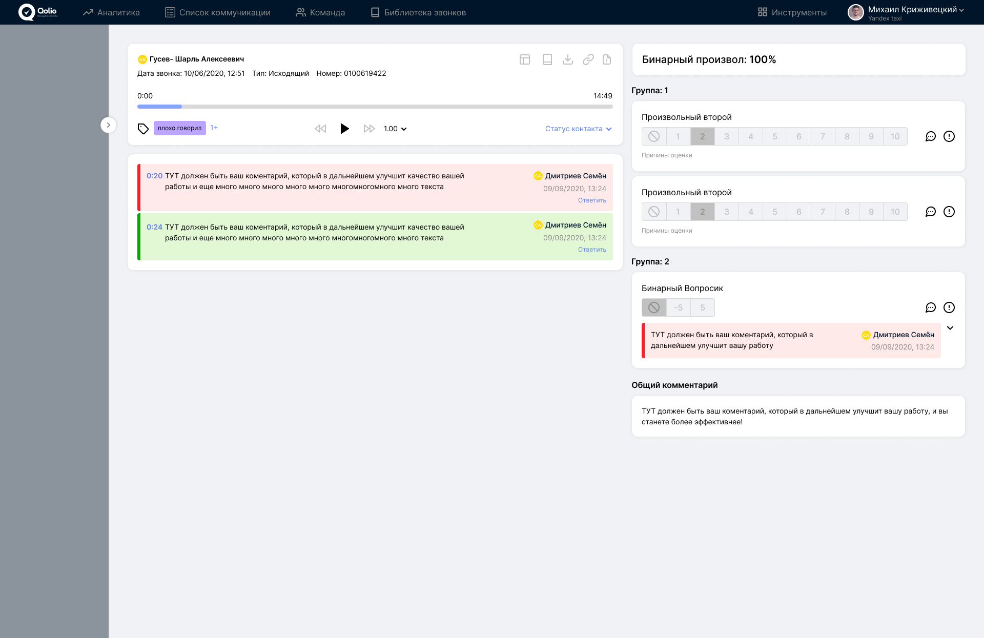 оставлять комментарии как к отдельному участку звонка, так и к целому критерию оценки;