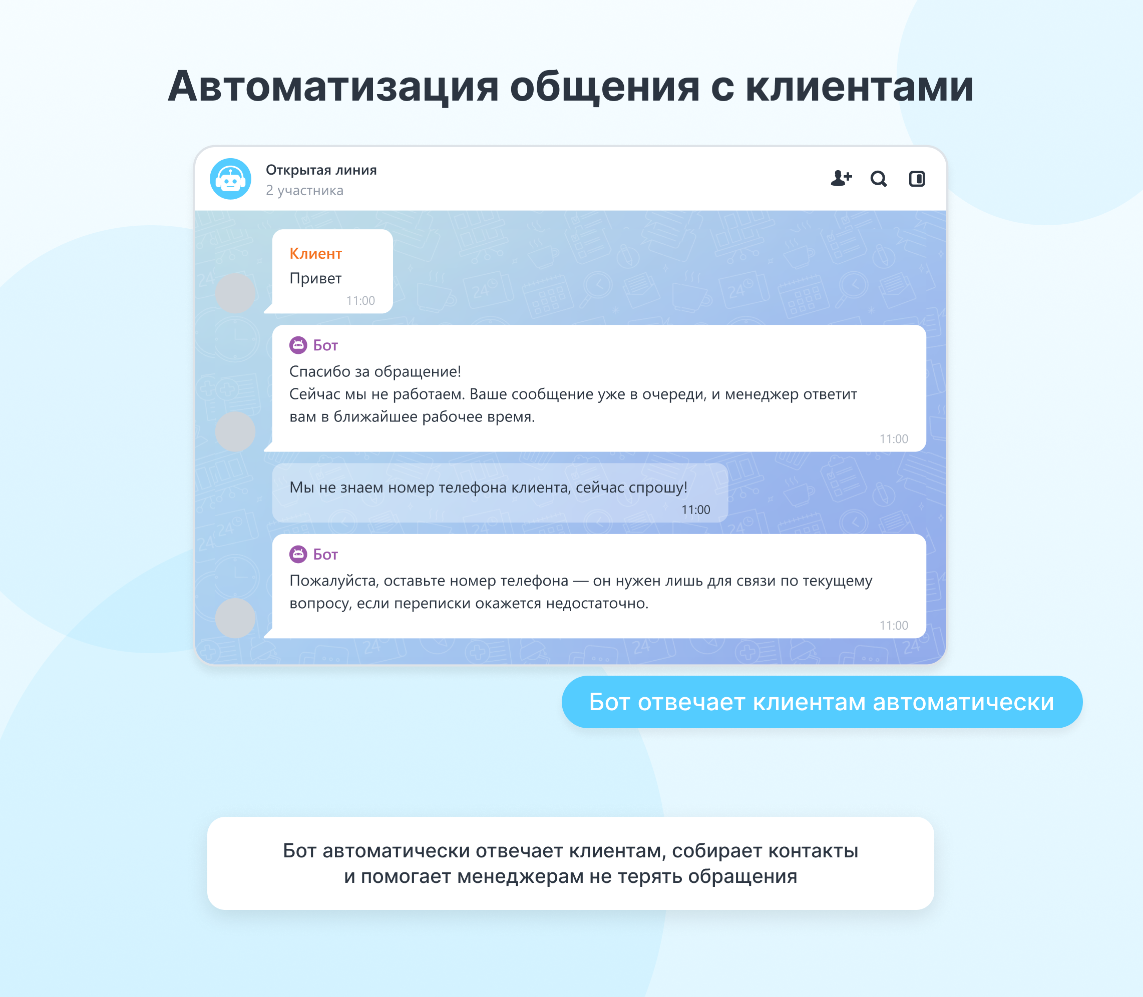 Бот автоматически подключается к диалогам и выполняет настроенные действия: