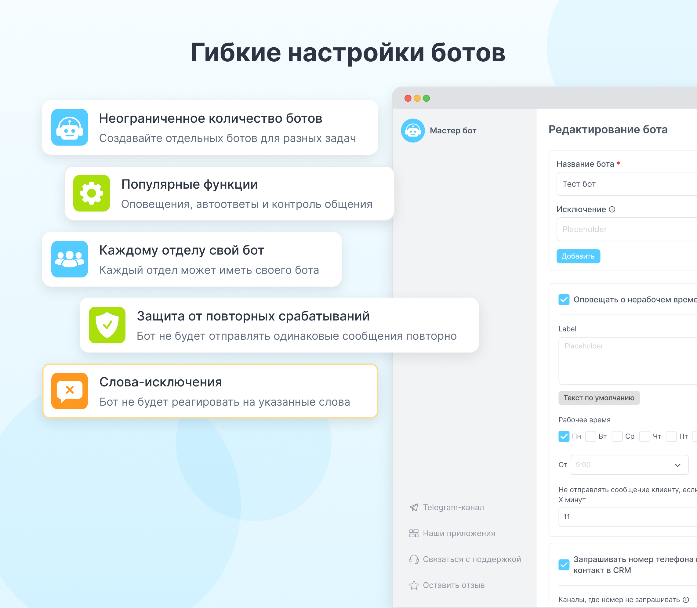 Отправляет клиенту автоматический ответ с выбранным текстом, если сообщение пришло вне рабочего графика компании.Запрос номера телефона