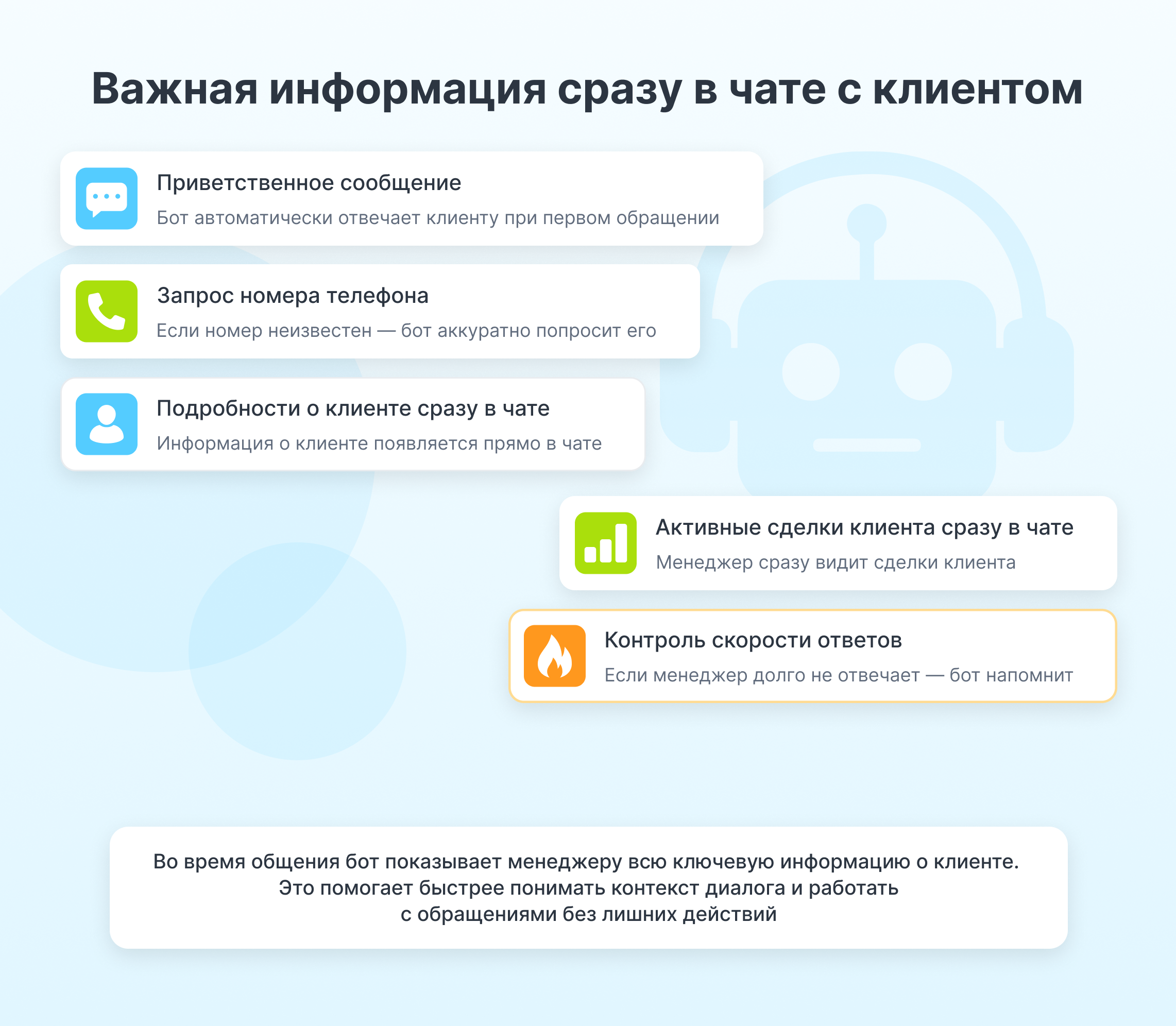 Пишет менеджеру в чат “невидимым” для клиента сообщением об активных лидах и сделках этого клиента.Карточка клиента для менеджера
