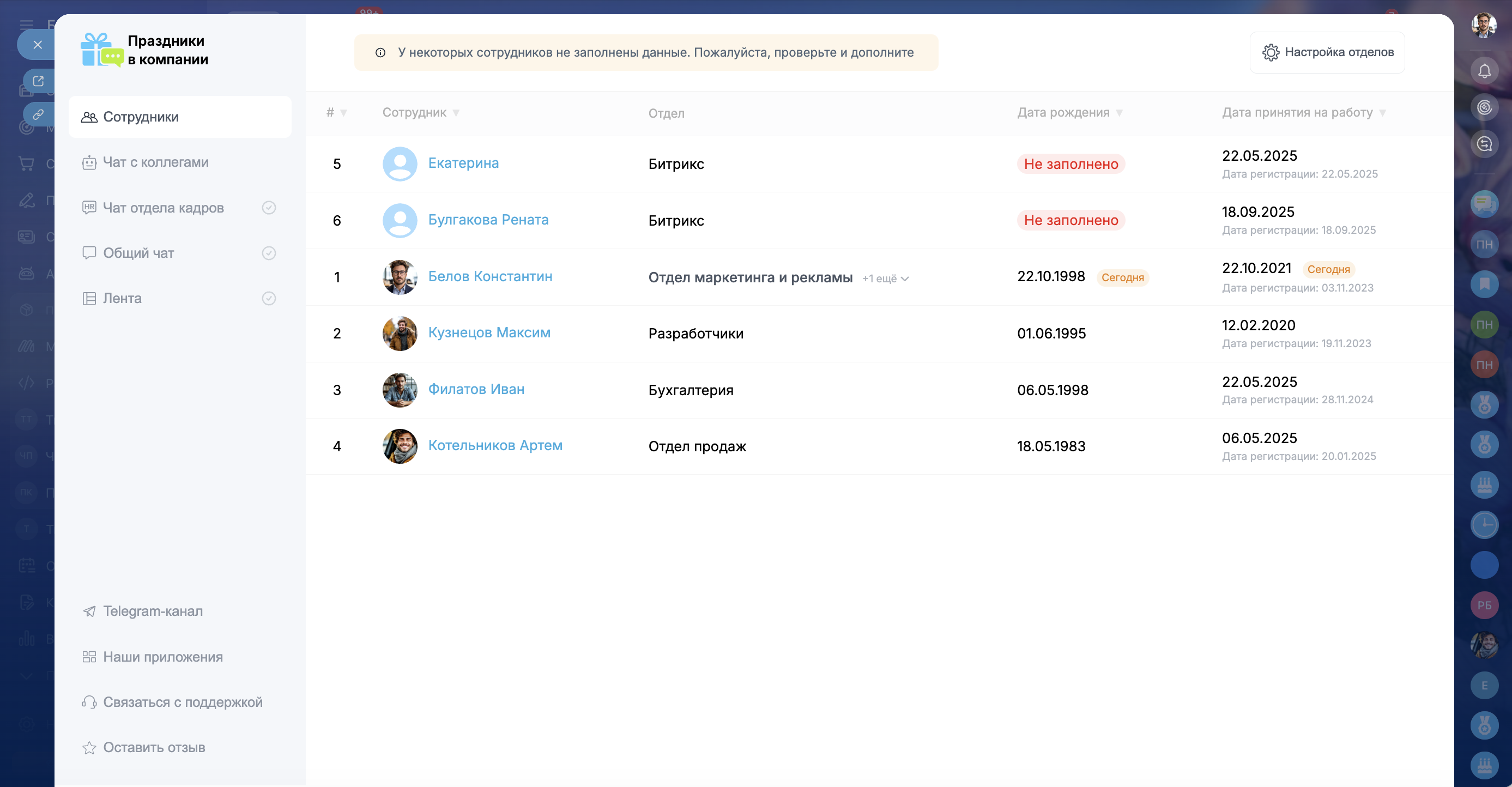 Отслеживание незаполненных профилей — приложение позволяет быстро определить, у кого из сотрудников не заполнена дата рождения или дата принятия на работу. Это помогает своевременно актуализировать информацию и избегать недоразумений