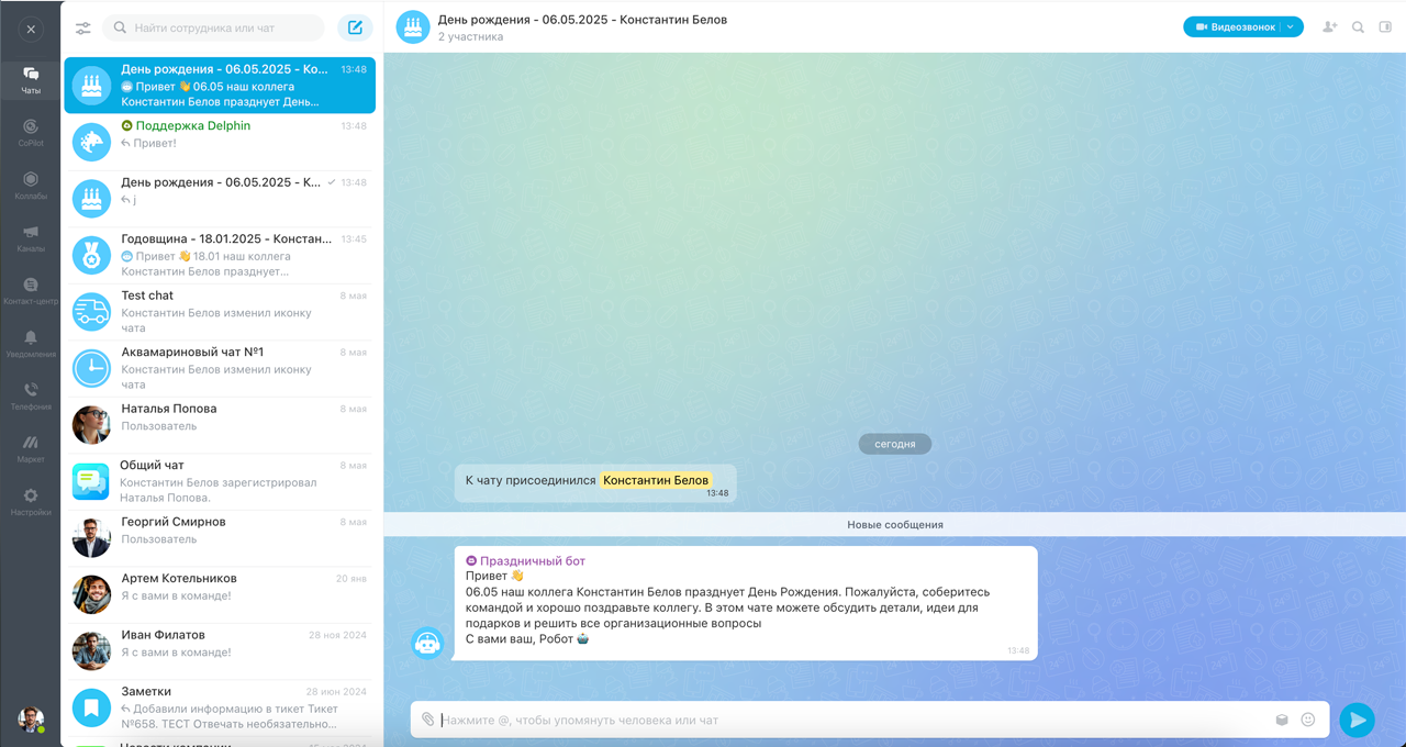 Общий чат - автоматическая публикация поздравления в общий чат компании