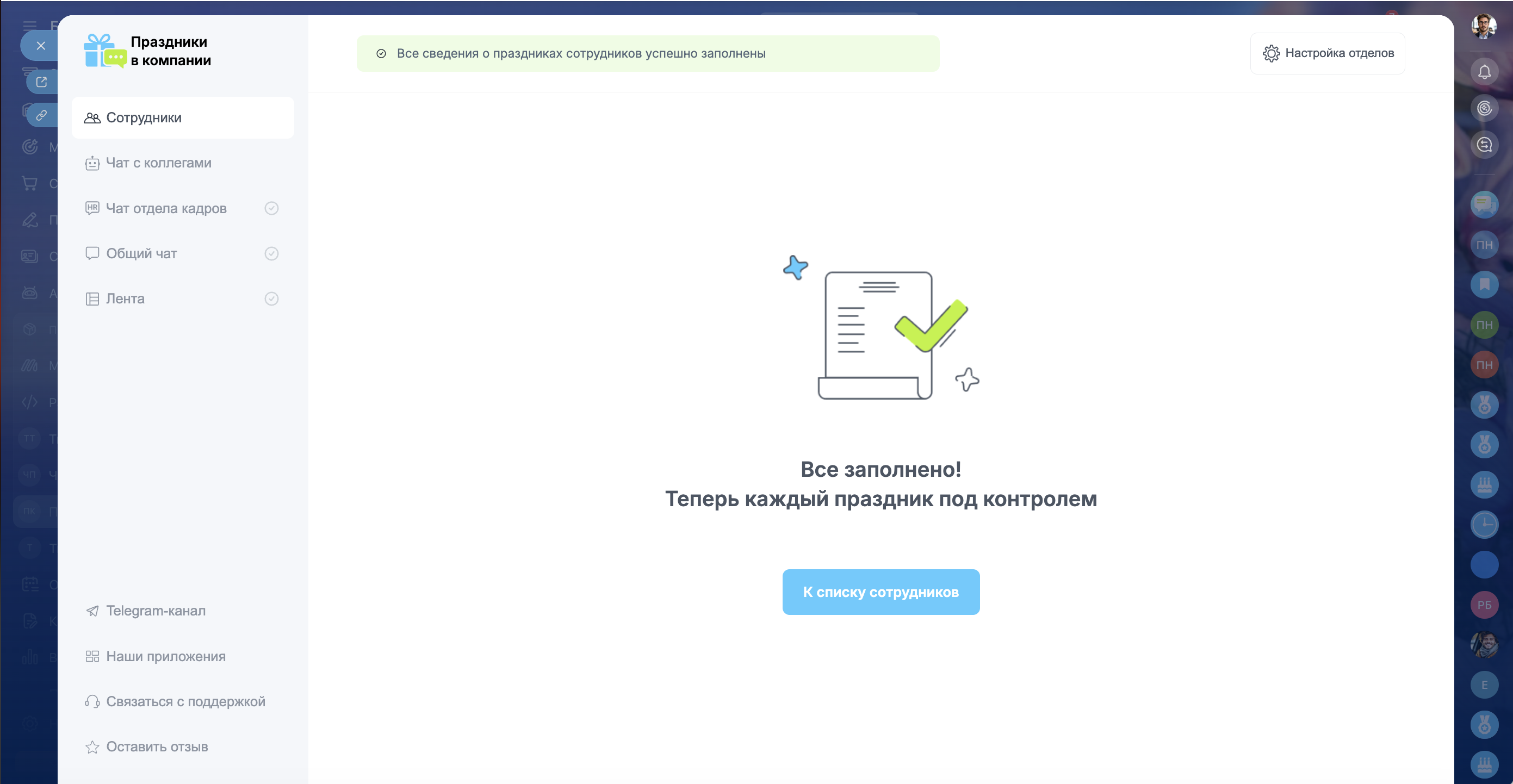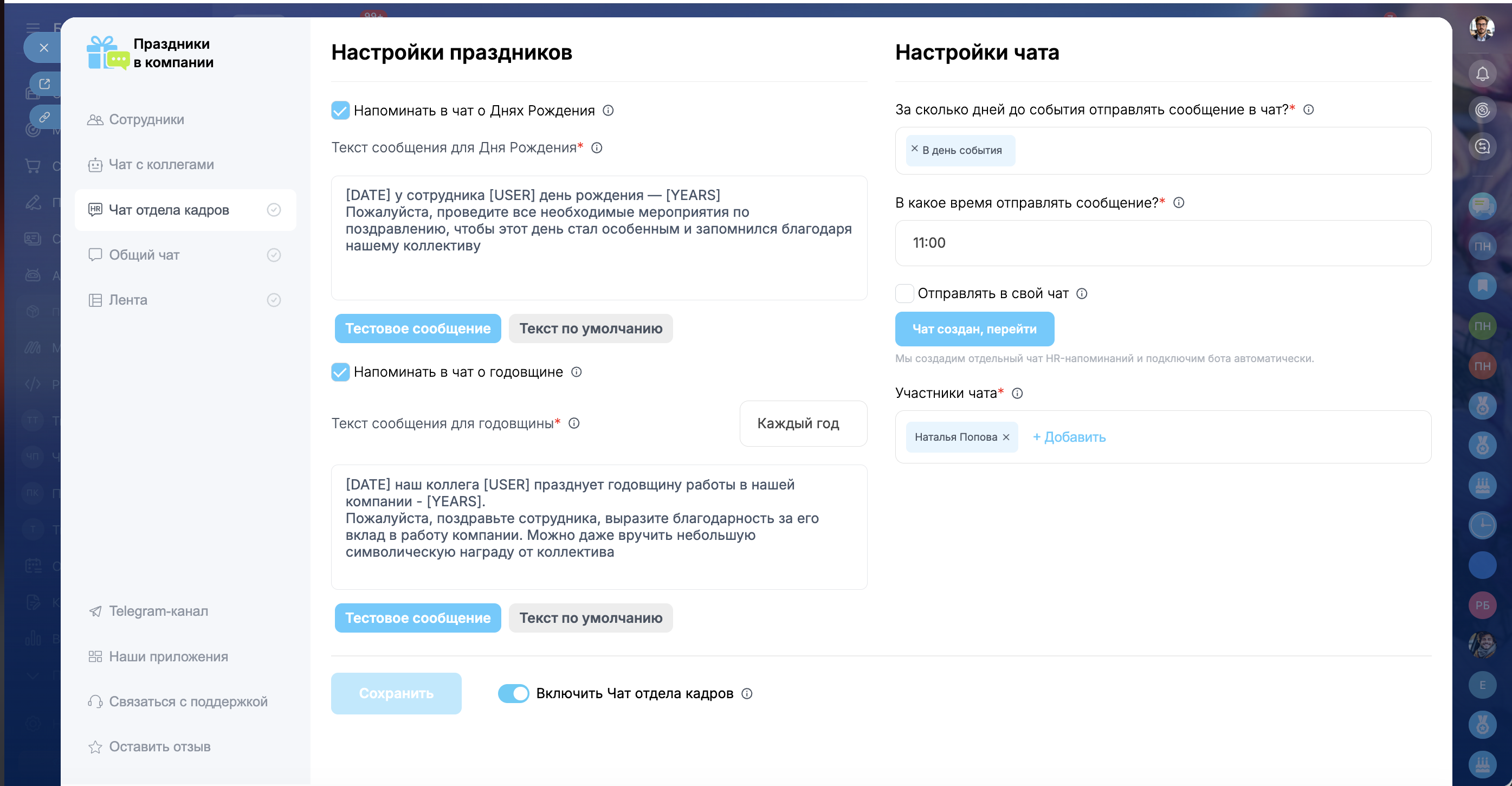 Чат отдела кадров — автоматический чат для отдела кадров или руководителей. Бот оповещает о праздниках заранее и дает время на организацию поздравления
