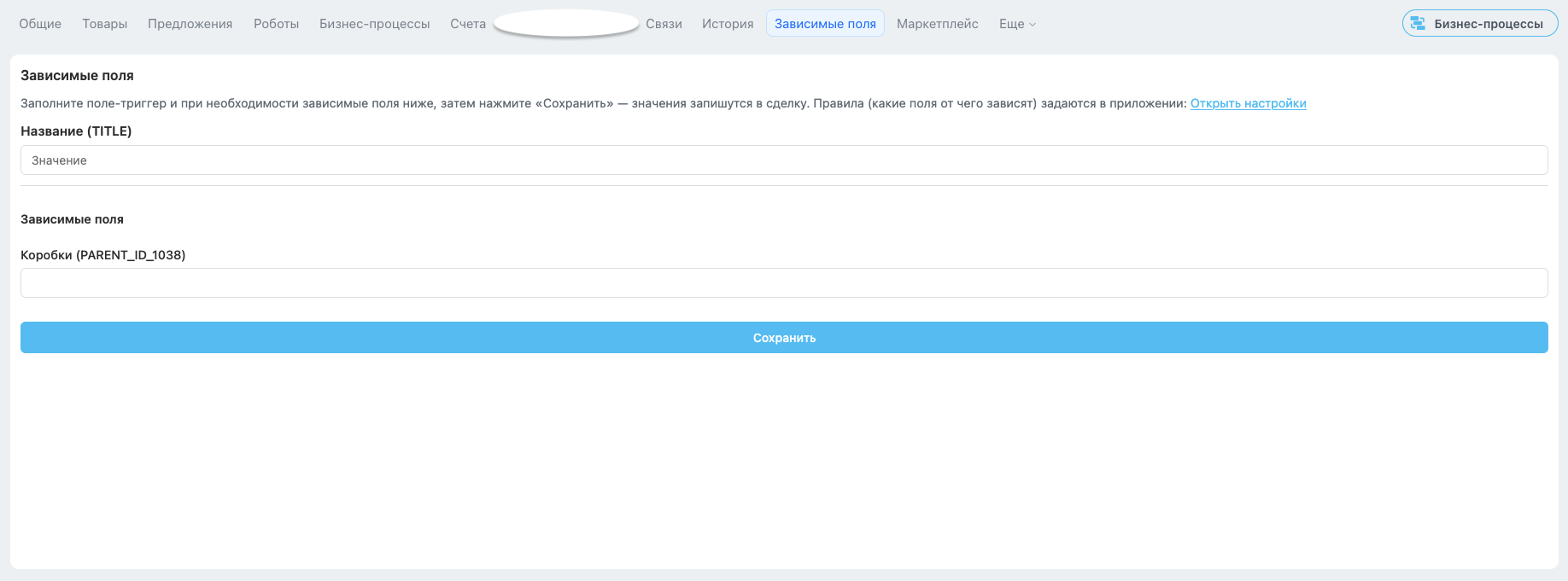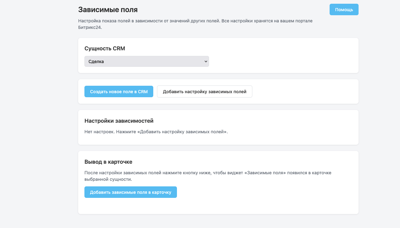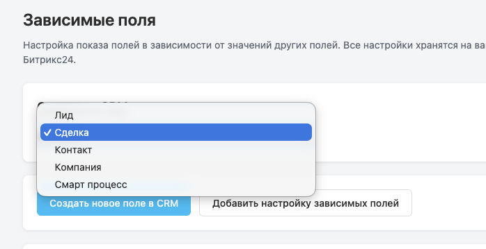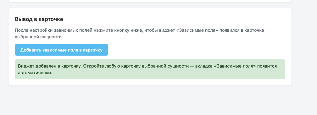 • Виджет во вкладке карточки: при открытии лида/сделки/контакта/компании отображается блок «Зависимые поля»; при выборе значения в триггере показываются только настроенные поля, данные сохраняются в карточку.