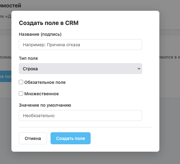 • Создание пользовательских полей CRM из приложения (строка, список, дата, число, да/нет, файл и др.) с обязательностью и значением по умолчанию.