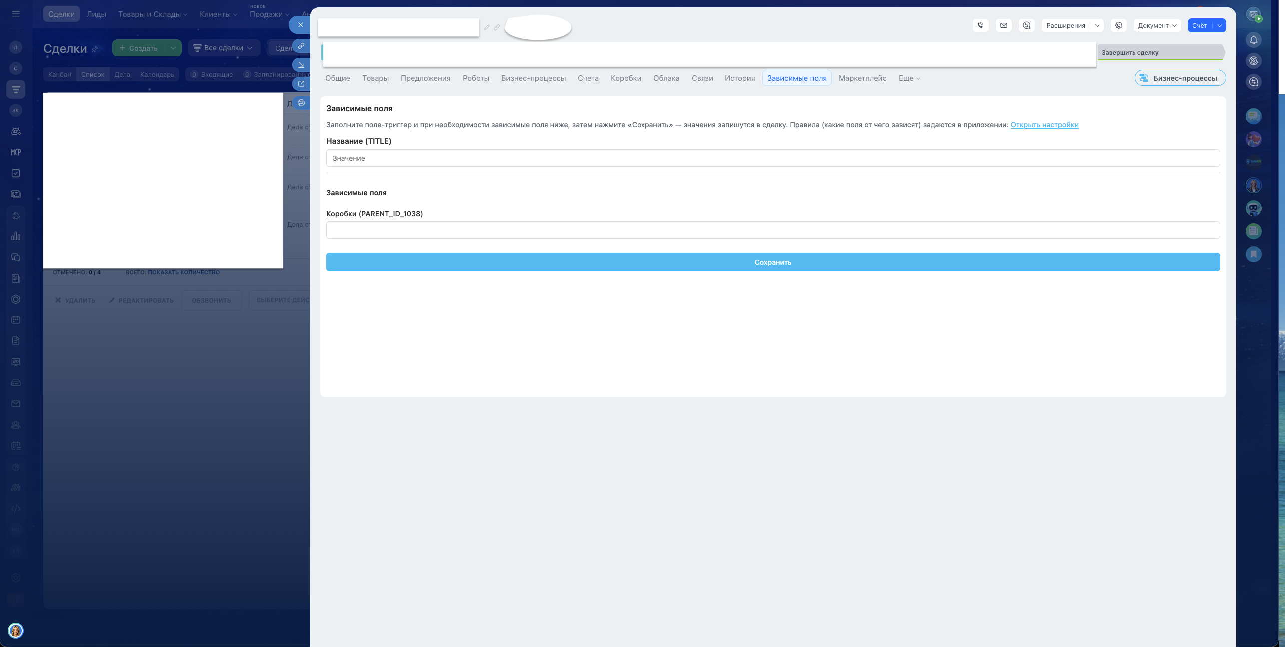 • Гибкая настройка сценариев «если значение X — показать поля A, B; если Y — поля C, D» для лидов, сделок, контактов, компаний и смарт-процессов.