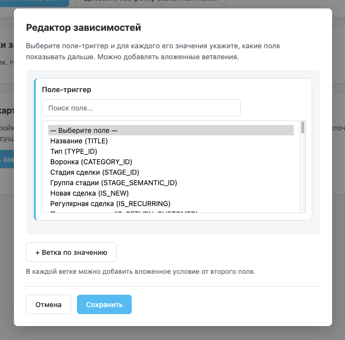 • Настройка зависимостей: одно поле-триггер и ветки по значениям (например, по типу сделки или причине отказа). Поддержка вложенных условий — глубина не ограничена.
