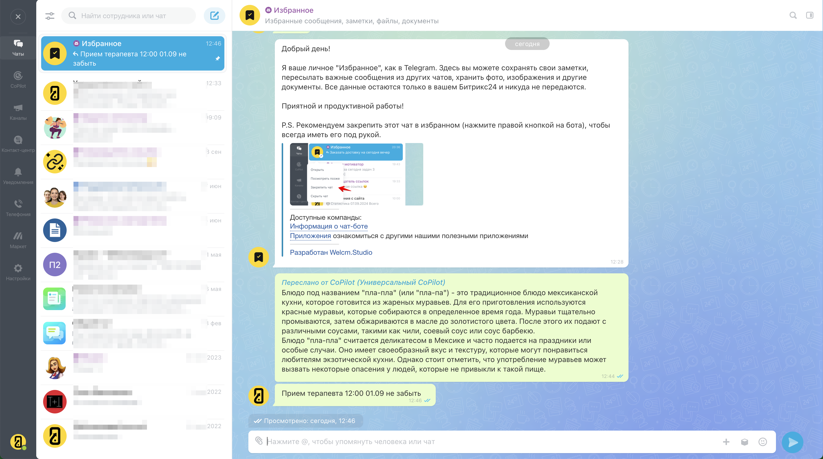 Позвольте представить вам нашего чат-бота — ваше личное "Избранное", как в Telegram, но с мощью Битрикс24. Здесь вы можете сохранять свои заметки, пересылать важные сообщения из других чатов, хранить фото, изображения и другие документы.