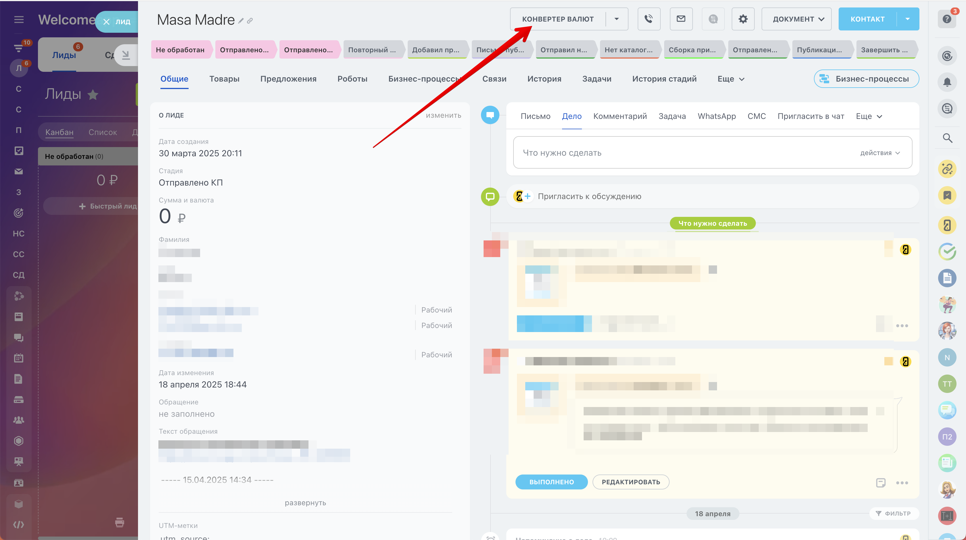 Конвертируйте валюты автоматически в рамках задач, сделок или документов.