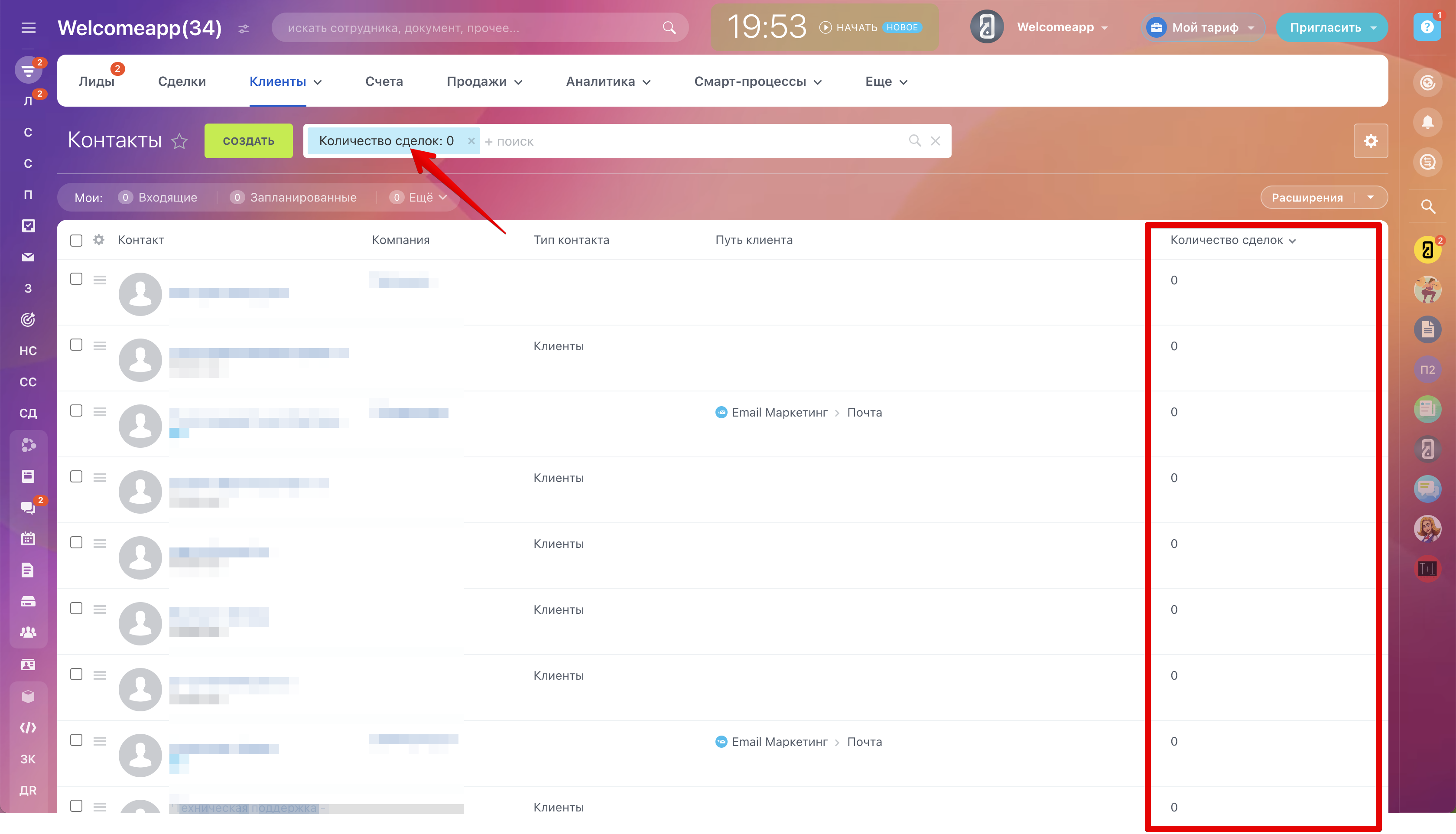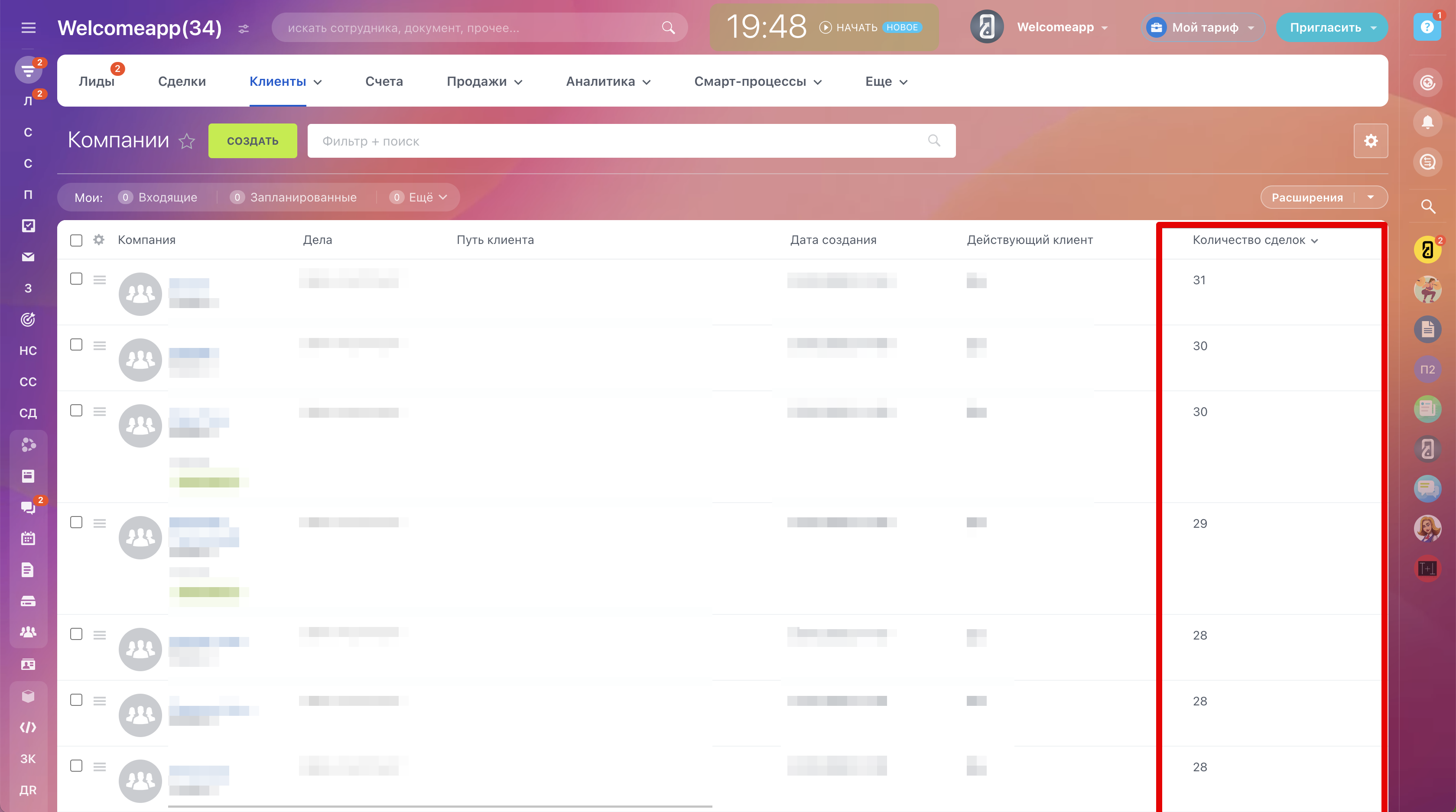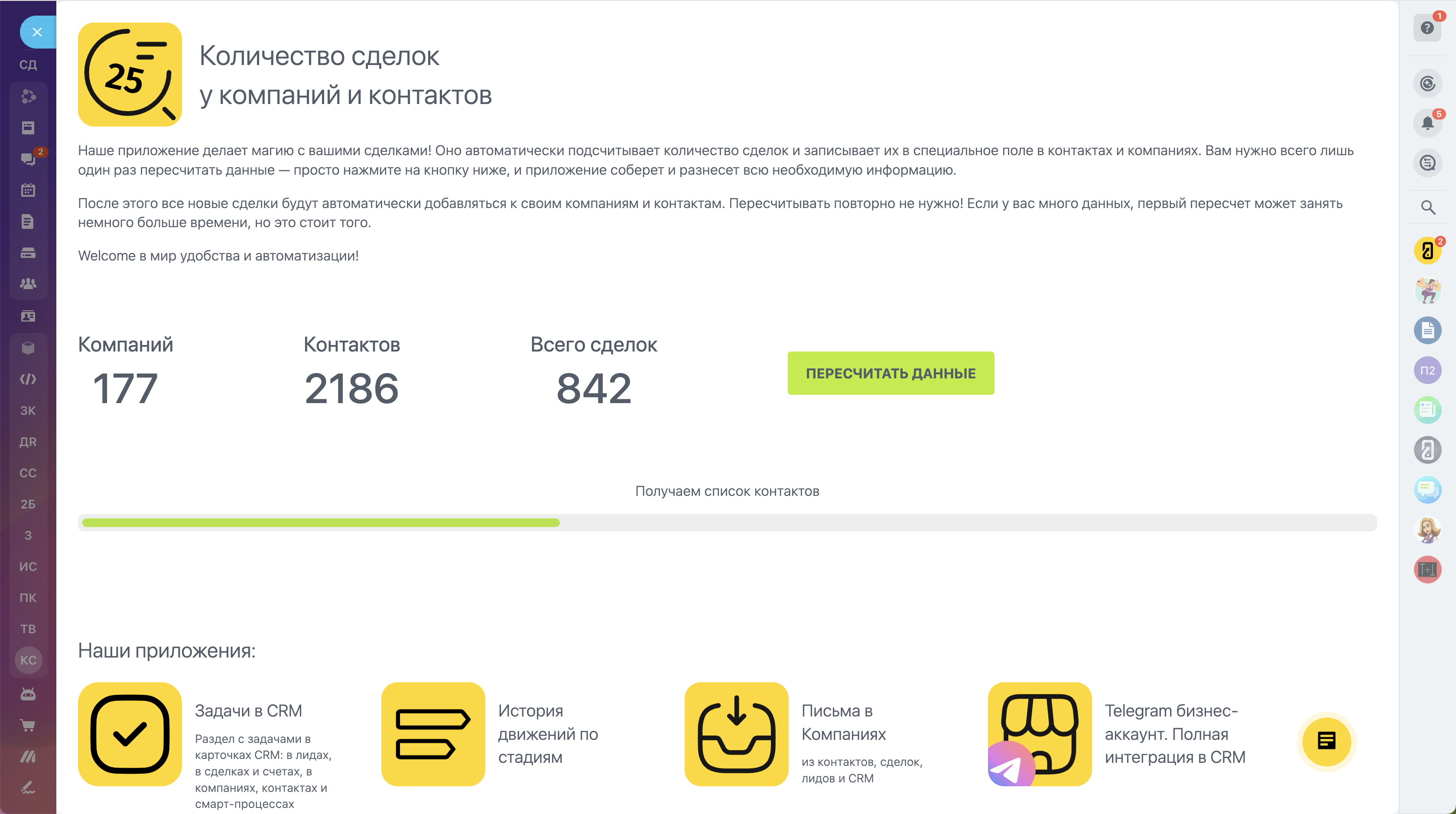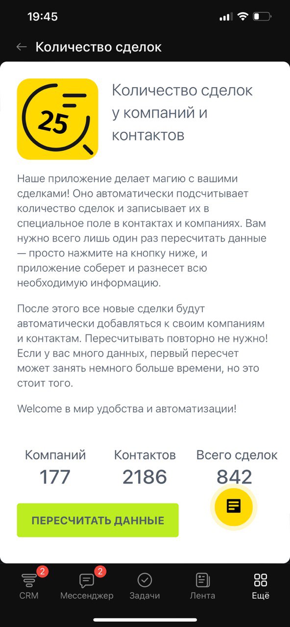 Приложение «Количество сделок у компаний и контактов» поможет вам легко искать и сортировать компании или контакты по количеству сделок. Хотите найти лидеров по продажам или компании и контакты без сделок? Теперь это просто!