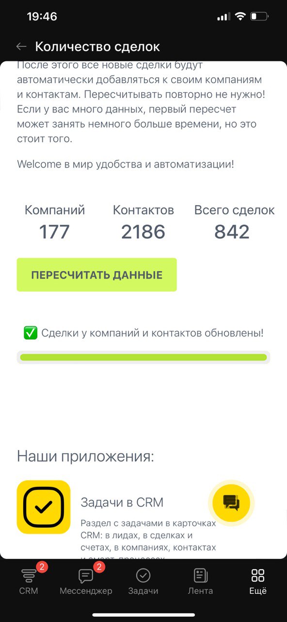 После первичного заполнения поля «Количество сделок» приложение автоматически будет обновлять данные при появлении новых сделок или их удалении.