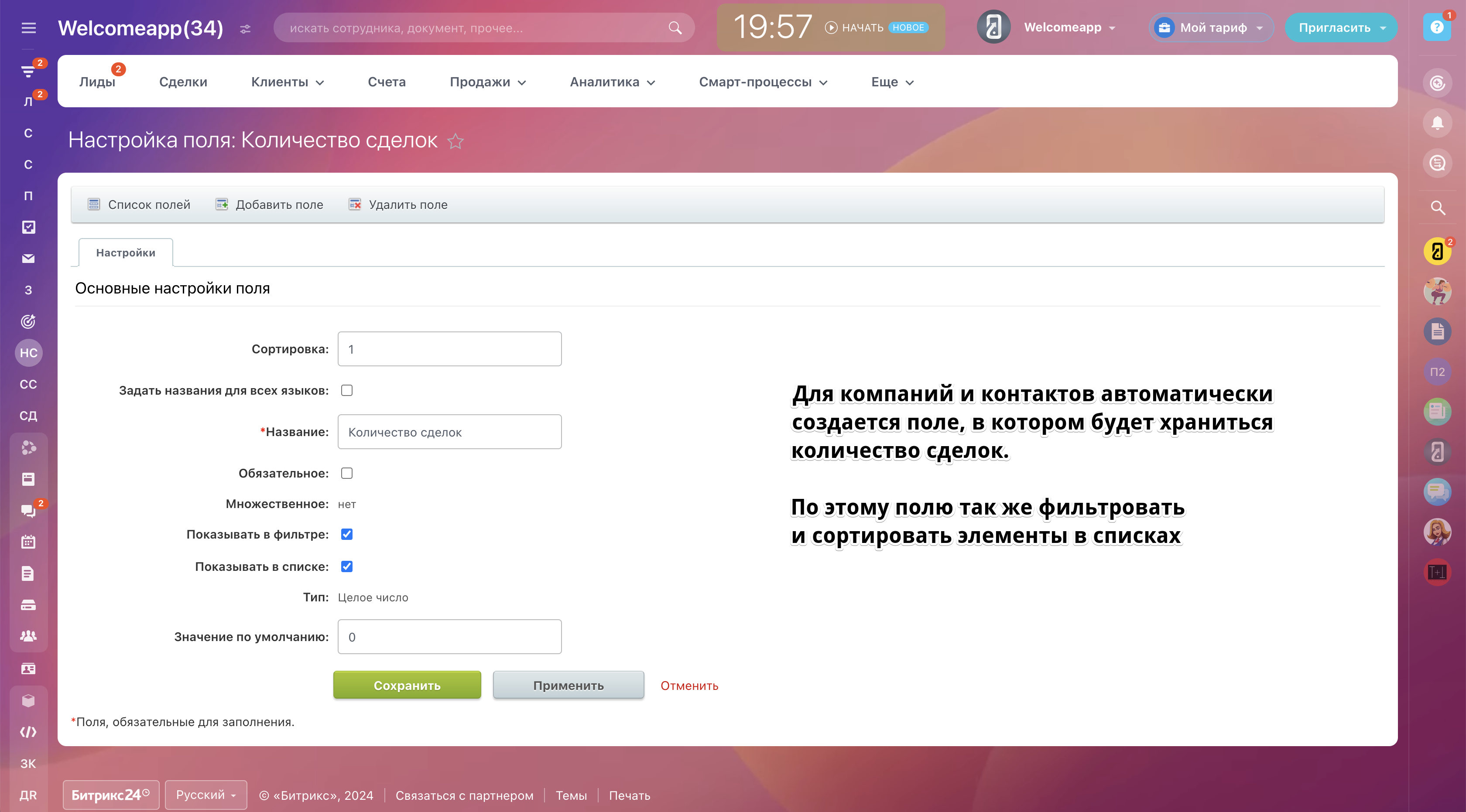 Наше приложение создает специальное поле у контакта и компании, где записывает количество сделок с ними. Теперь на стандартных страницах списка компаний и контактов в Битрикс24 вы сможете видеть всю нужную информацию. Вы также можете использовать это поле в фильтрах, выводить его в карточку контакта или компании и применять для автоматизации в роботах и триггерах.