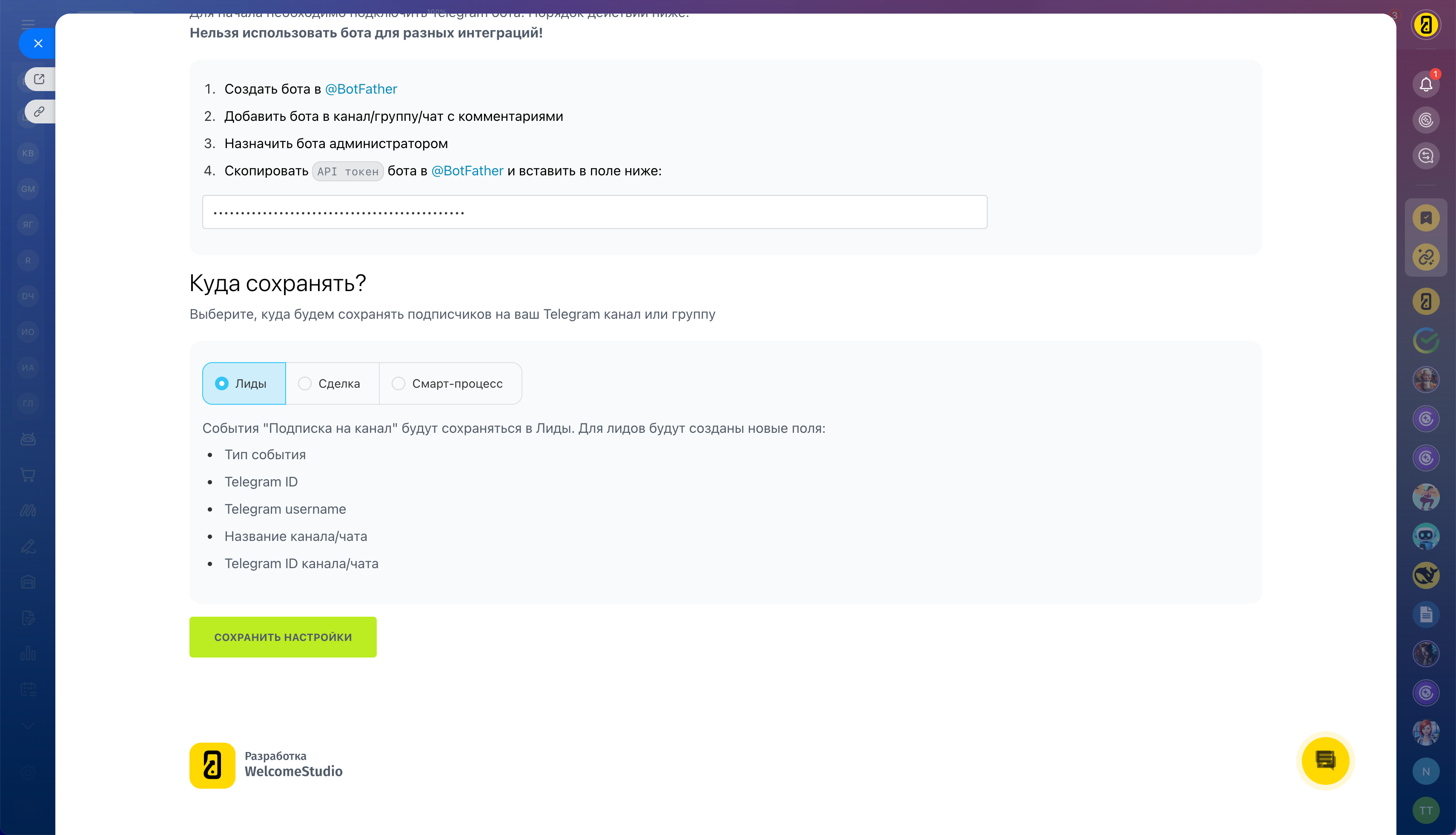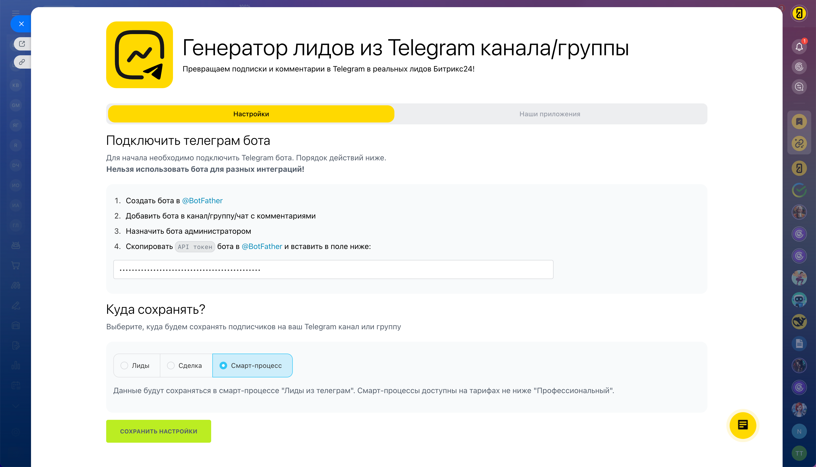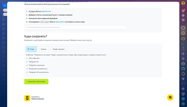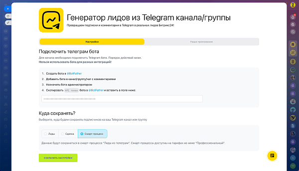 Это идеальный инструмент для SMM‑специалистов и компаний, которые активно продвигают товары или услуги в своих Telegram‑каналах. Просто укажите API‑ключ вашего бота, настройте интеграцию — и начните получать больше заявок в привычной CRM.