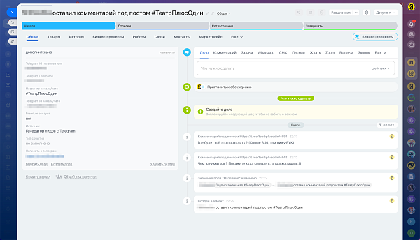 Из карточки лида можно сразу написать клиенту в Telegram — никакого лишнего клика, только живое и своевременное общение.