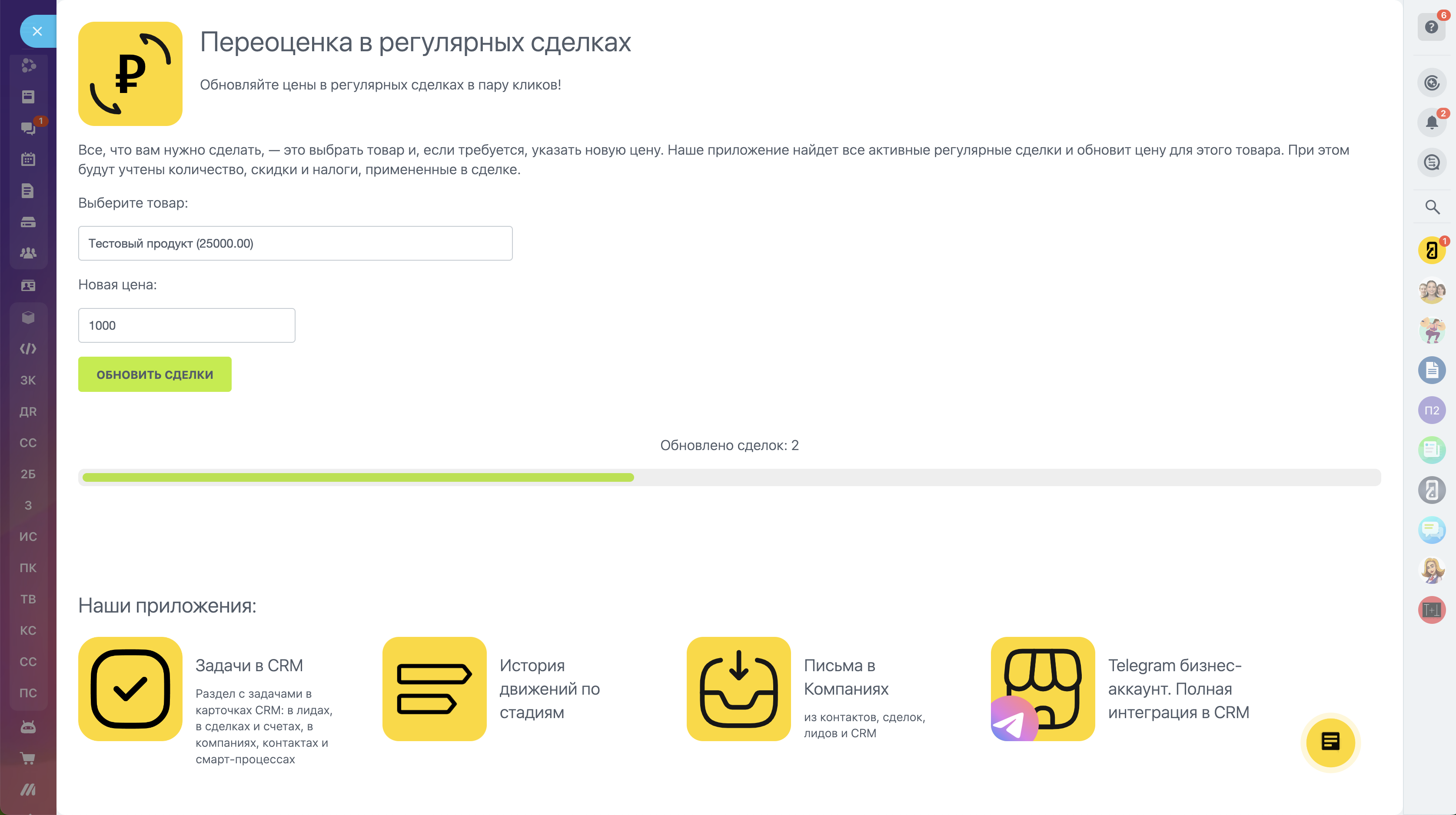 Наше приложение поможет вам изменить стоимость товара в регулярных сделках всего за пару кликов. Больше не нужно изменять каждую сделку вручную!